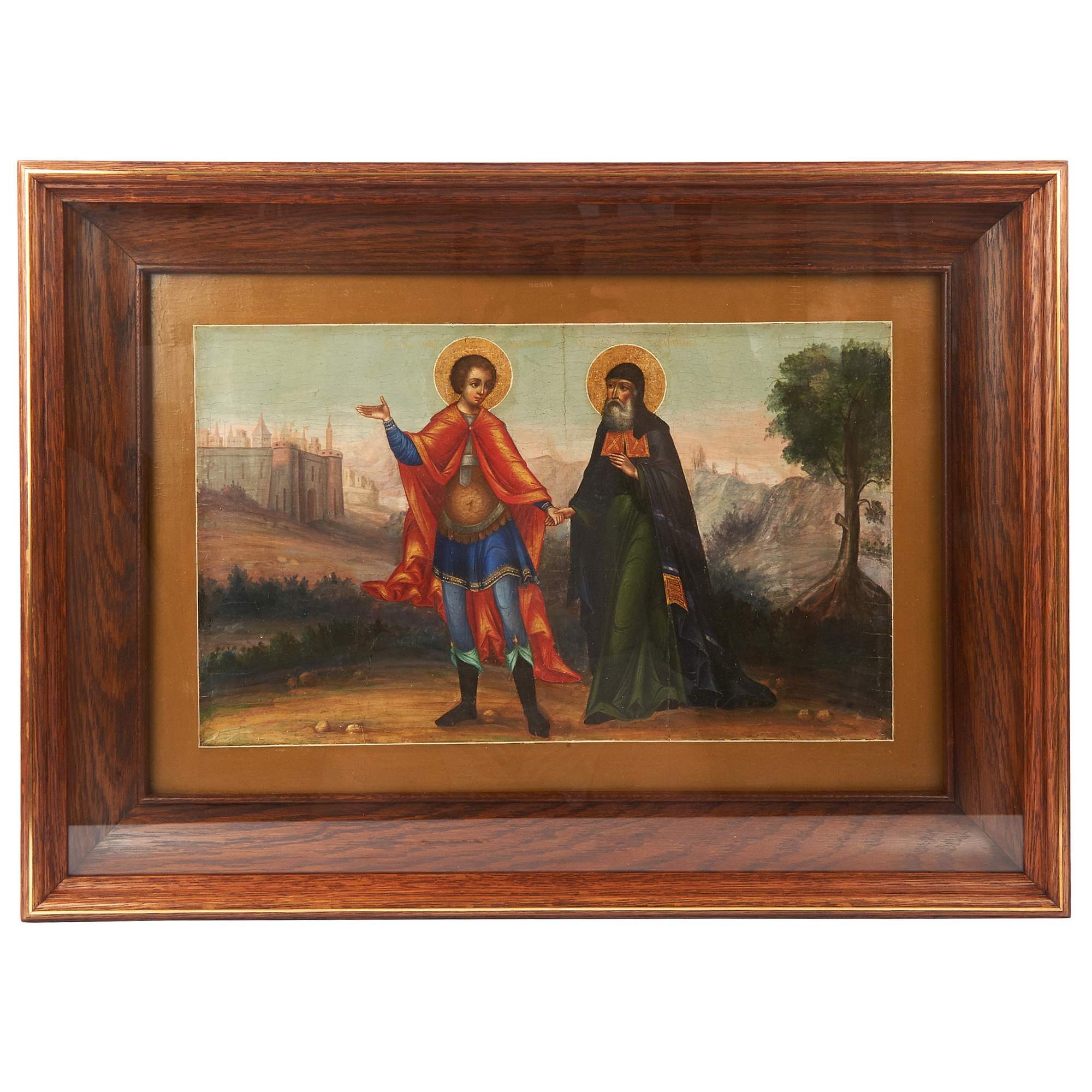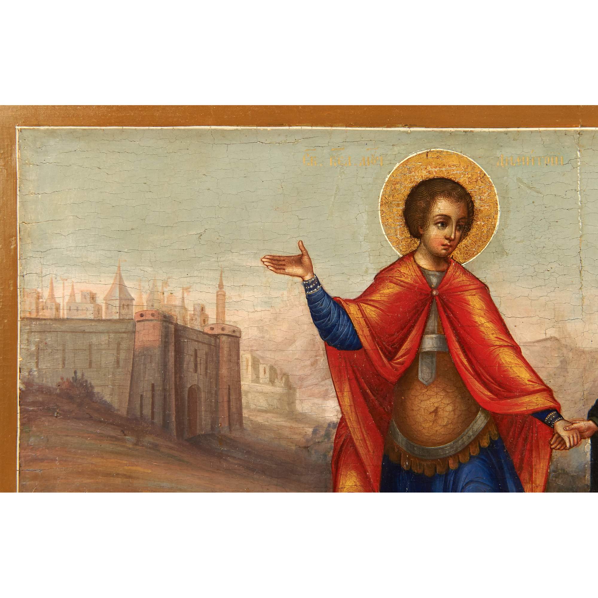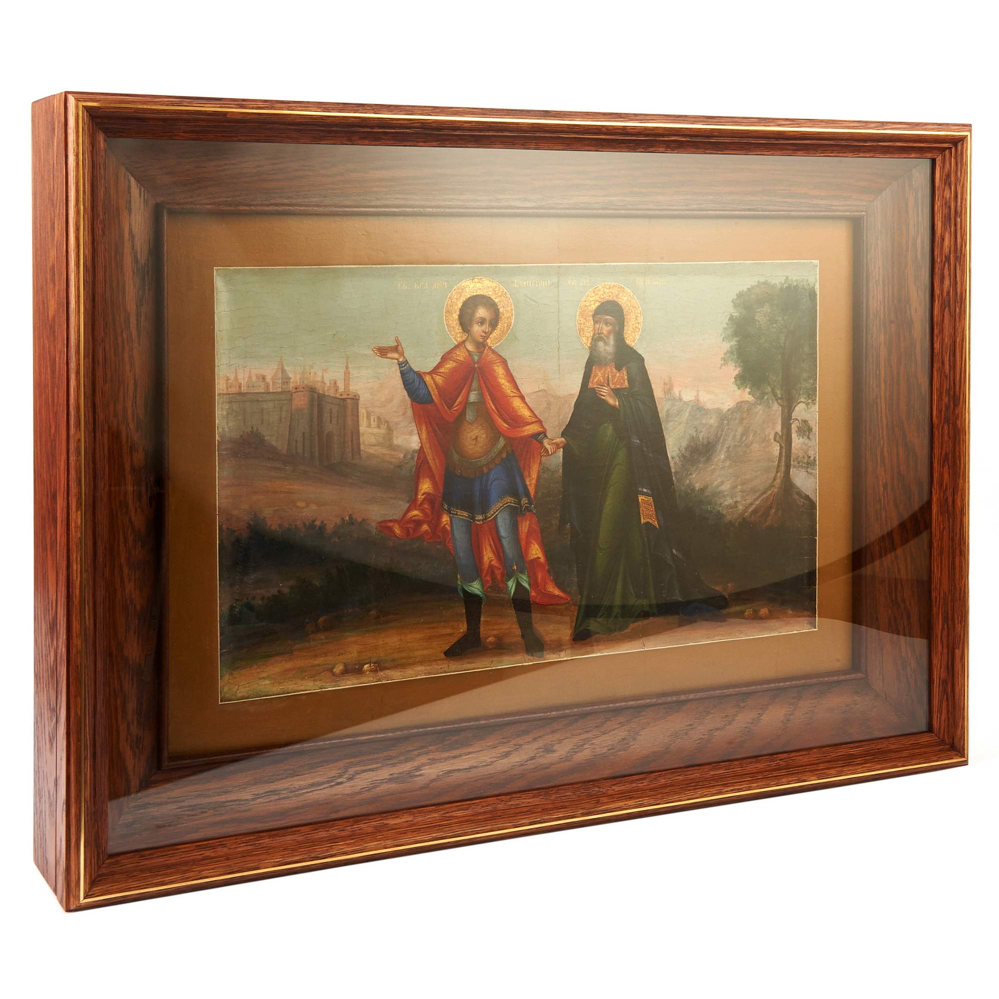 Прекрасная старинная икона, примечательная не только художественными особенностями, сочетание академической живописи и традиционной иконописи, но и исключительной редкостью сюжета. Оригинальный текст, с описанием чуда, VII века повествует о одном из посмертных деяний великомученика Димитрия Солунского: Епископ Киприан был захвачен в плен и отдан в рабство; однажды ему явился юноша в доспехах, и велел ему следовать за собой сохраняя молчание. Последовав за ним епископ вышел к Фессалоникам, после чего юноша исчез. Епископ искал дом своего спасителя, желая его отблагодарить, но зайдя в храм Димитрия Солунского узнал его образ на иконе. По возвращению в Африку Киприан построил храм во имя святого, в котором впоследствии многие верующие исцелялись, используя масло от лампады перед иконой великомученика. Изображенный сюжет действительно крайне редко встречается в иконографии, хотя сам Димитрий Солунский – любимый и известный в России святой. Его почитание в Русской Православной церкви началось сразу после Крещения Руси. О любви к святому свидетельствует Димитриевский монастырь в Киеве, Димитриевский собор во Владимире, построенный Всеволодом Большое Гнездо, и, разумеется, первый каменный храм Московского Кремля, заложенный Даниилом Московским – на его месте в последствии был воздвигнут Успенский собор. Художественные особенности иконы соответствуют Палехской манере иконописи конца XIX – начала XX века. Палехские мастера пользовались большим спросом на всей территории Российской империи. Впитав традицию московской, новгородской, ярославской и строгановской школы они умело совмещали ее с европейской - натуралистической, создавая многофигурные сложные композиции и живописные образы. Палехские иконописцы работали при росписях таких известных памятников как Грановитая палата Московского Кремля, Троице-Сергиева Лавра и Новодевичий монастырь. Икона имеет безусловное культурное и музейное значение. Ее художественная ценность прекрасно дополняет глубокий сакральный смысл редкого сюжета. Хорошая сохранность, антиквариат.