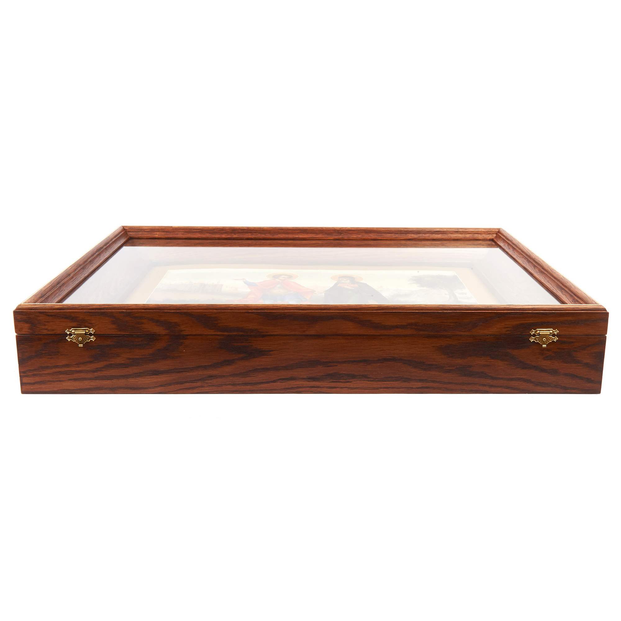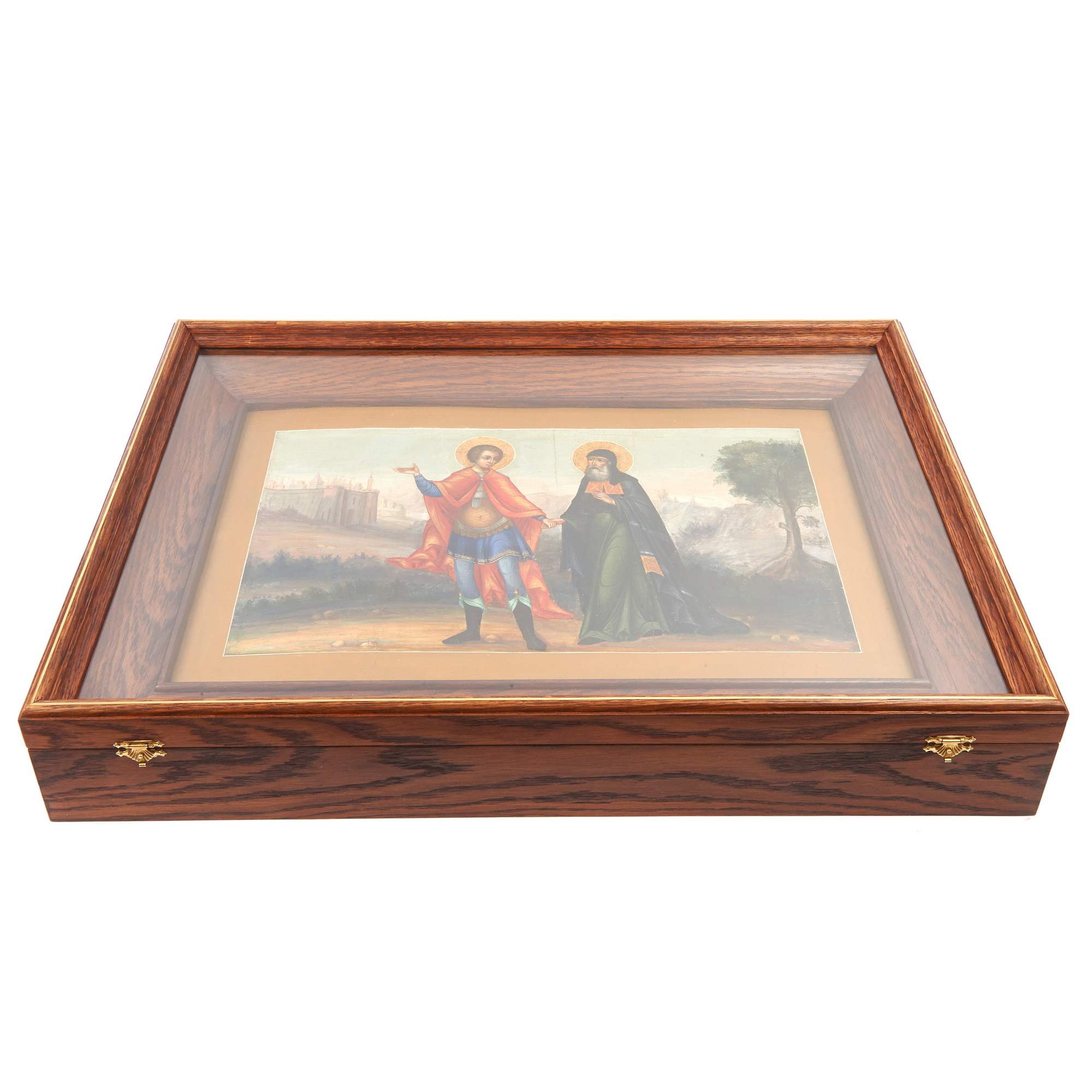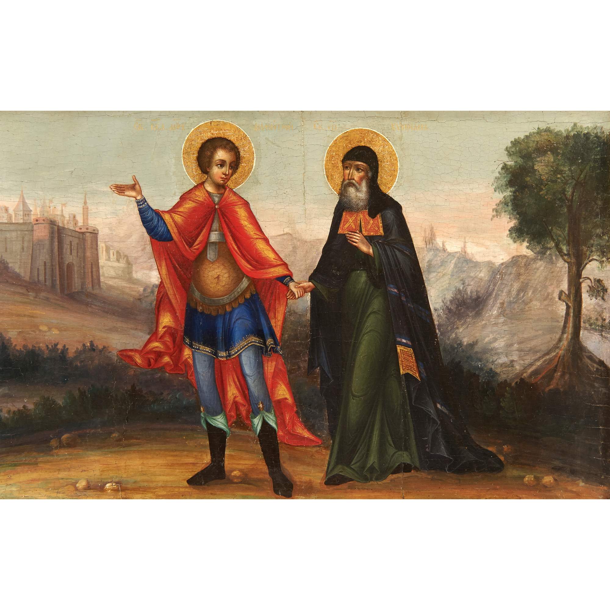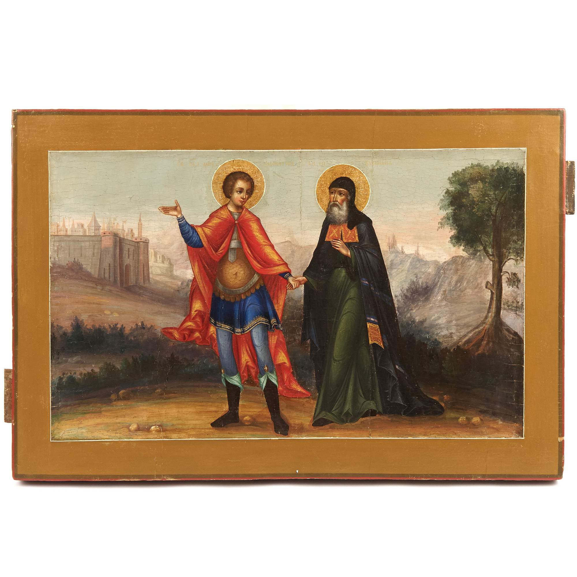 Прекрасная старинная икона, примечательная не только художественными особенностями, сочетание академической живописи и традиционной иконописи, но и исключительной редкостью сюжета. Оригинальный текст, с описанием чуда, VII века повествует о одном из посмертных деяний великомученика Димитрия Солунского: Епископ Киприан был захвачен в плен и отдан в рабство; однажды ему явился юноша в доспехах, и велел ему следовать за собой сохраняя молчание. Последовав за ним епископ вышел к Фессалоникам, после чего юноша исчез. Епископ искал дом своего спасителя, желая его отблагодарить, но зайдя в храм Димитрия Солунского узнал его образ на иконе. По возвращению в Африку Киприан построил храм во имя святого, в котором впоследствии многие верующие исцелялись, используя масло от лампады перед иконой великомученика. Изображенный сюжет действительно крайне редко встречается в иконографии, хотя сам Димитрий Солунский – любимый и известный в России святой. Его почитание в Русской Православной церкви началось сразу после Крещения Руси. О любви к святому свидетельствует Димитриевский монастырь в Киеве, Димитриевский собор во Владимире, построенный Всеволодом Большое Гнездо, и, разумеется, первый каменный храм Московского Кремля, заложенный Даниилом Московским – на его месте в последствии был воздвигнут Успенский собор. Художественные особенности иконы соответствуют Палехской манере иконописи конца XIX – начала XX века. Палехские мастера пользовались большим спросом на всей территории Российской империи. Впитав традицию московской, новгородской, ярославской и строгановской школы они умело совмещали ее с европейской - натуралистической, создавая многофигурные сложные композиции и живописные образы. Палехские иконописцы работали при росписях таких известных памятников как Грановитая палата Московского Кремля, Троице-Сергиева Лавра и Новодевичий монастырь. Икона имеет безусловное культурное и музейное значение. Ее художественная ценность прекрасно дополняет глубокий сакральный смысл редкого сюжета. Хорошая сохранность, антиквариат.