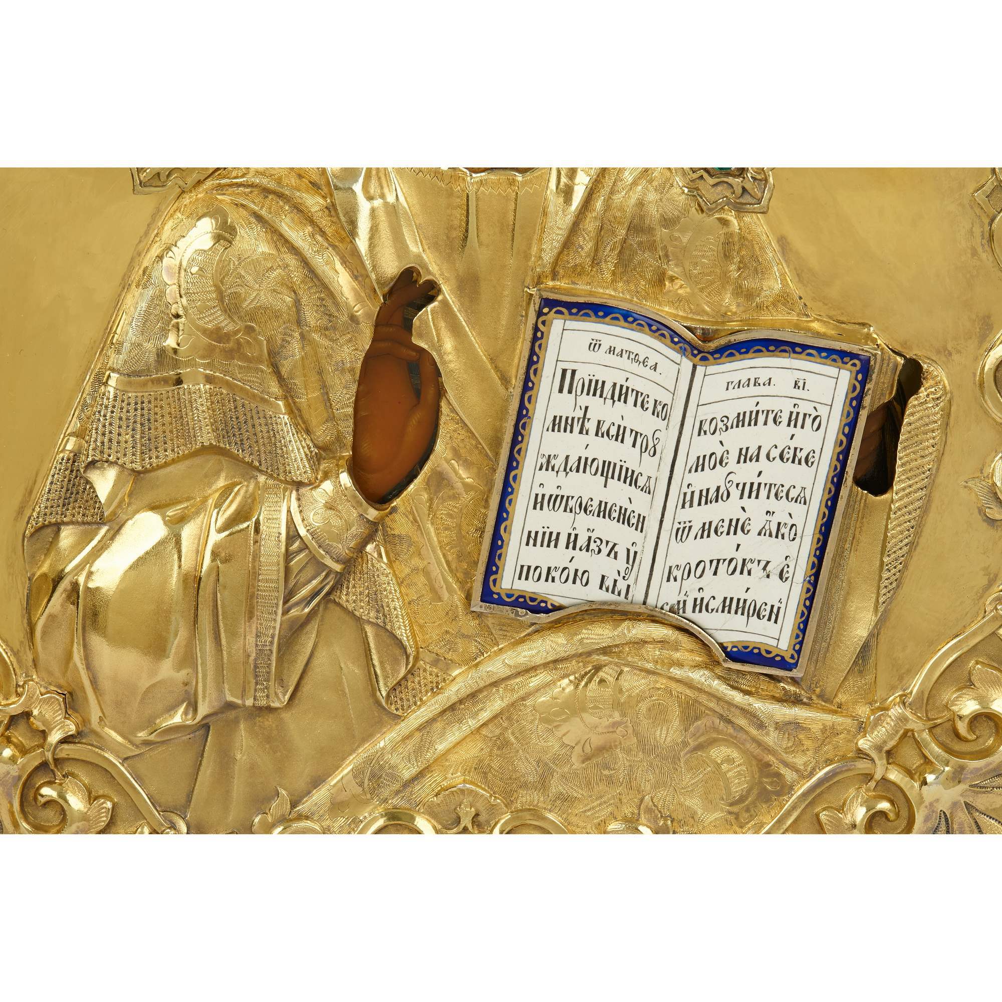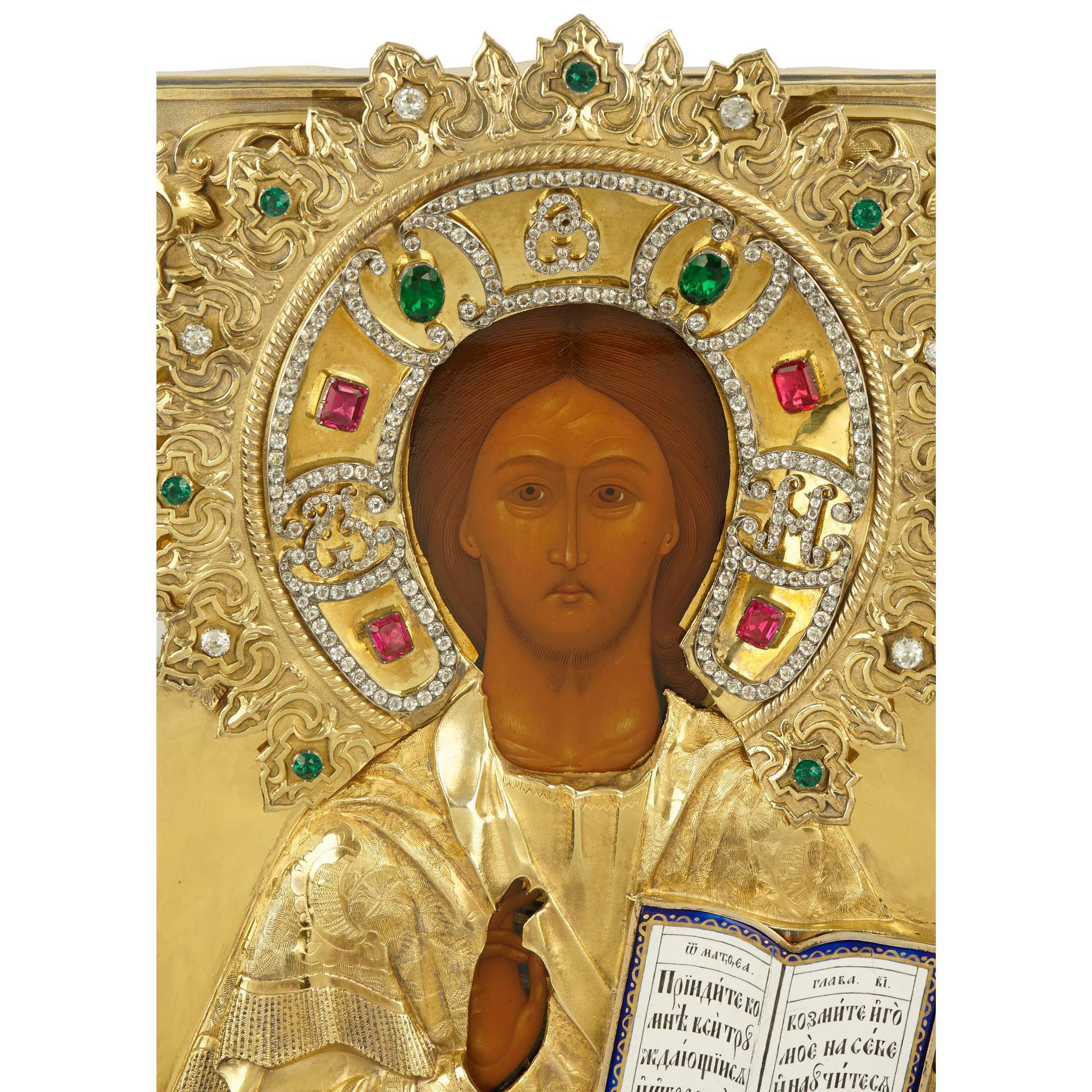 Прекрасная старинная икона с поясным изображением Господа Вседержителя в традиционной иконографии: с раскрытым Евангелием, на котором начертан текст от Матфея «Приидите ко Мне все труждающиеся и обремененные…», и благословляющим жестом десницы. Великолепное письмо, тонкие линии, нежные белые блики. Схожие образы встречаются среди наследия Строгановской иконописной школы и Мстерской художественной традиции. Икона украшена великолепным массивным серебряным золоченым окладом, выполненным с применением ювелирных техник и материалов, в том числе невероятно красивой выемчатой эмалью, имитирующей изогнувшиеся страницы, филигранно выполненной гравировкой и инкрустацией. Венец спасителя украшен вставками из горного хрусталя. Представленная икона безусловно является частью великого наследия русской иконописной школы, знаменитого на весь мир не только прекрасным качеством исполнения, но и внутренней духовной наполненностью.
