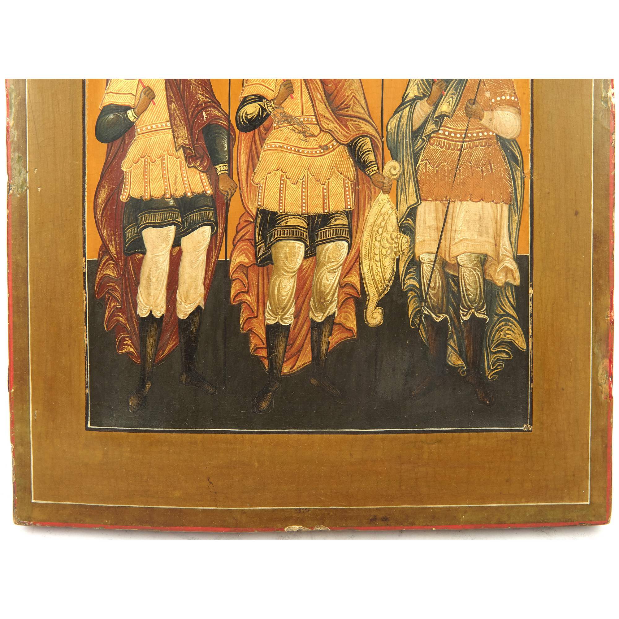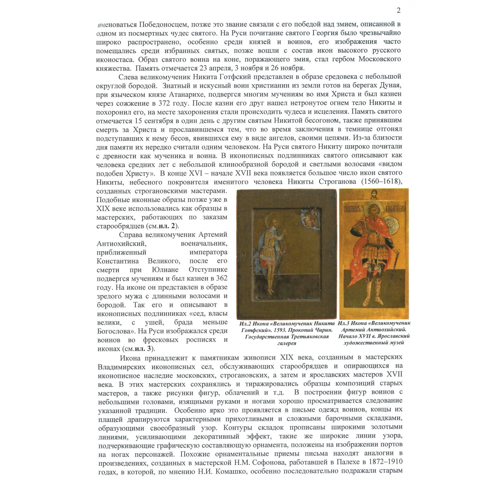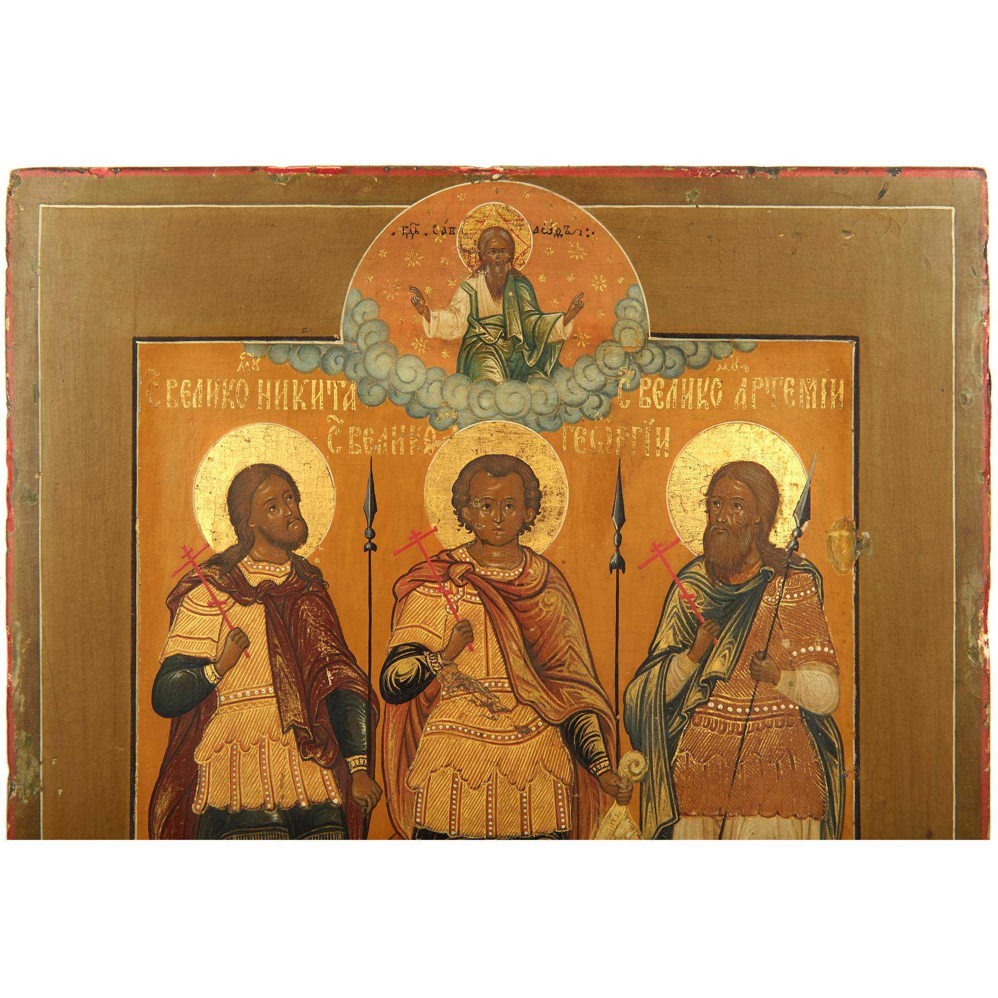 Старинная икона с изображением святых воинов-великомучеников, написанная во Владимирских иконописных селах с опорой на наследие московских, Строгановский и Ярославских мастеров XVII в. При создании представленной иконы мастер использовал много золота, что является дорогостоящим оформлением. Золотые линии на одеждах усиливают декоративный эффект, чему также способствуют широкие линии узора на портах мучеников. Сами образы воинов прописаны изящно, в традиционном стиле. Над воинами на облаках изображён Бог Саваоф, одеяния Его с золотым асистом, качественно прописано личное, несмотря на небольшой размер фигуры. Святые воины-великомученики Никита, Георгий и Артемий пострадали за Христа в 4 в., показав великую стойкость и ревность за веру. Церковью они почитаются, как покровители воинов, а Георгий Победоносец также считается покровителем русских правителей. Икона «Святые воины-великомученики Никита, Георгий и Артемий» имеет историко-культурное, художественное и музейное значение.
