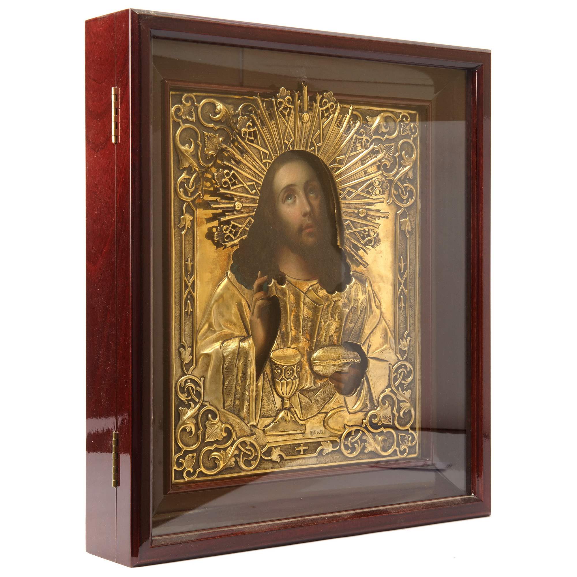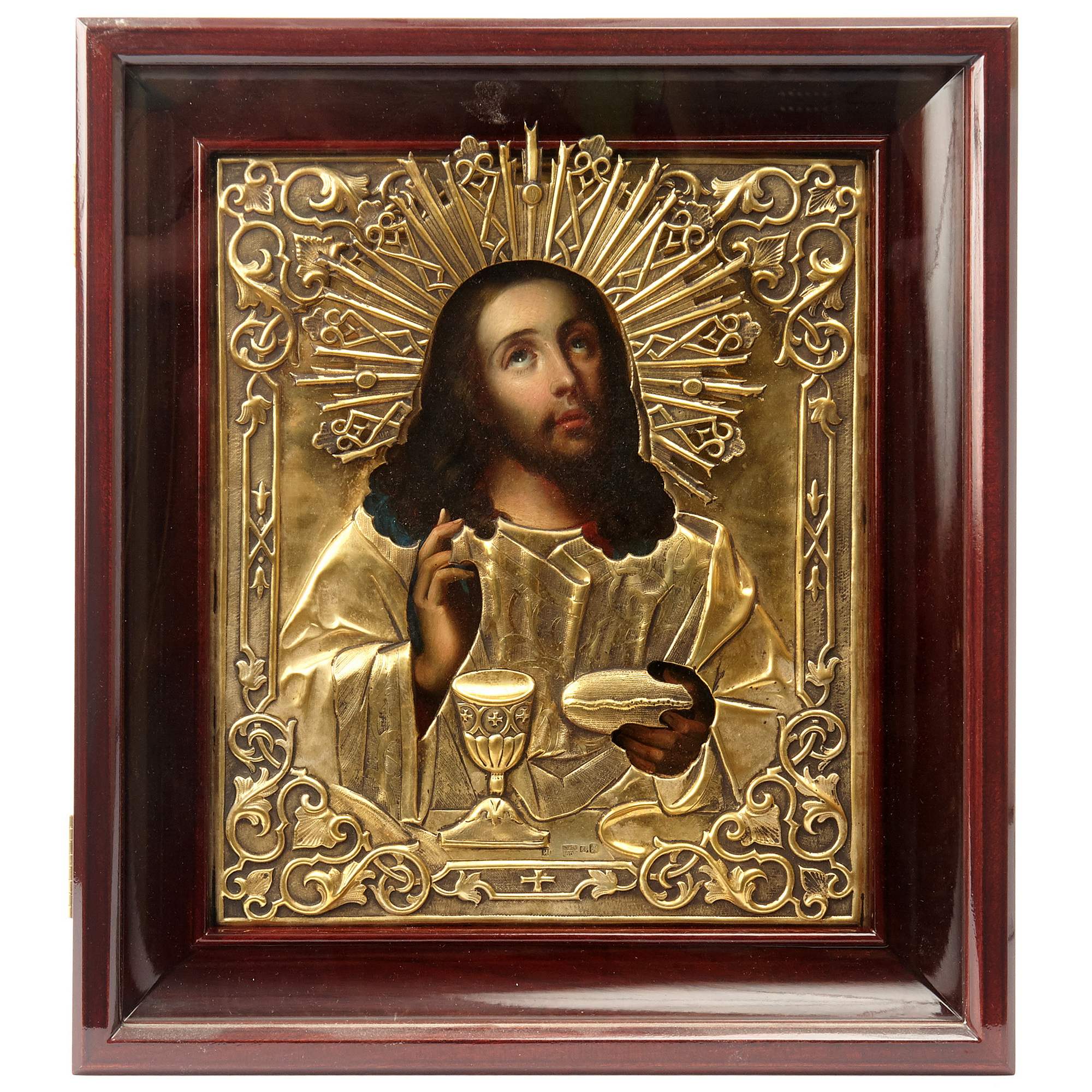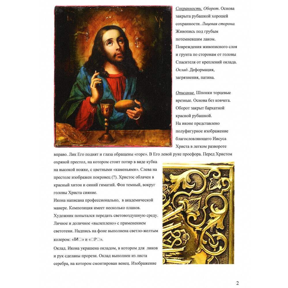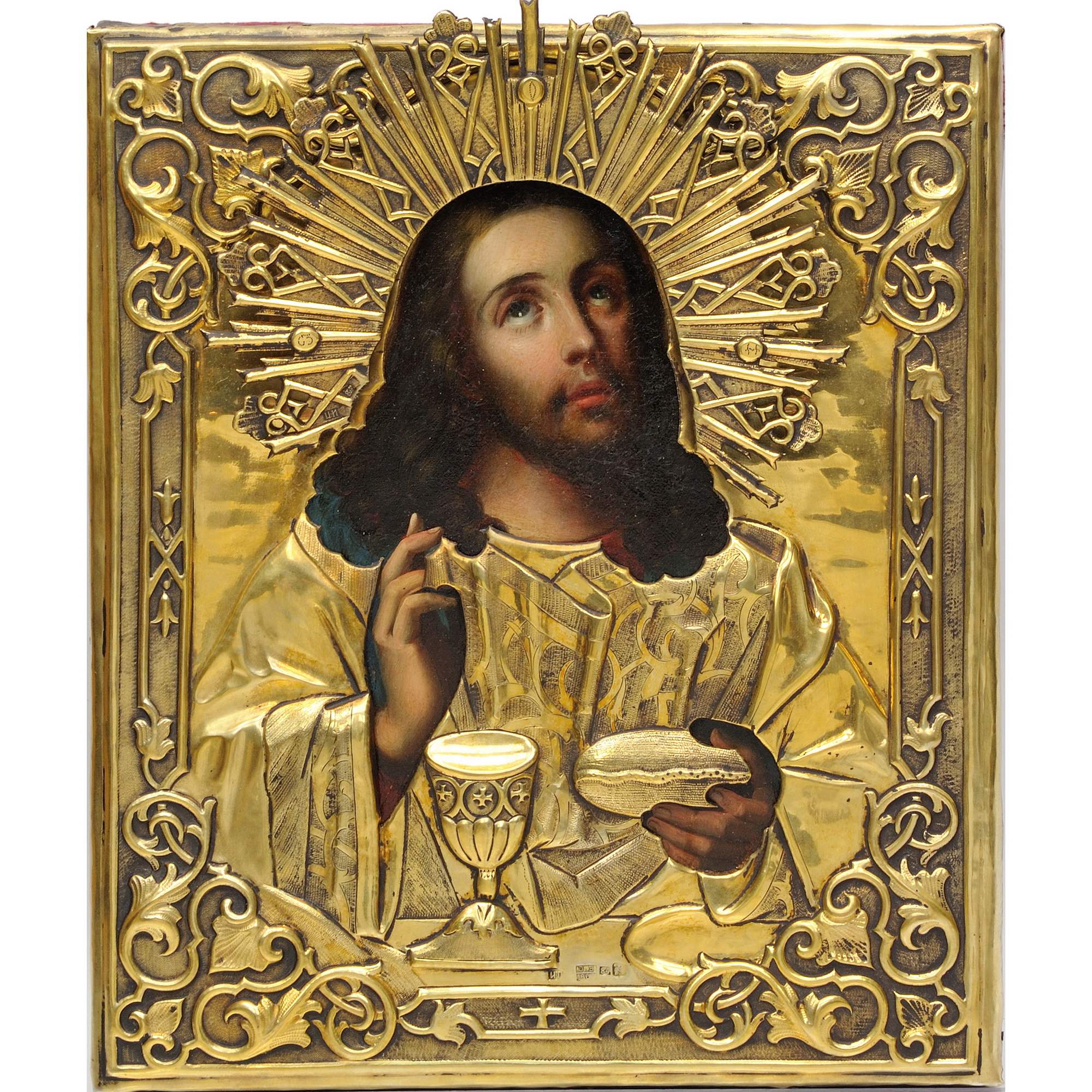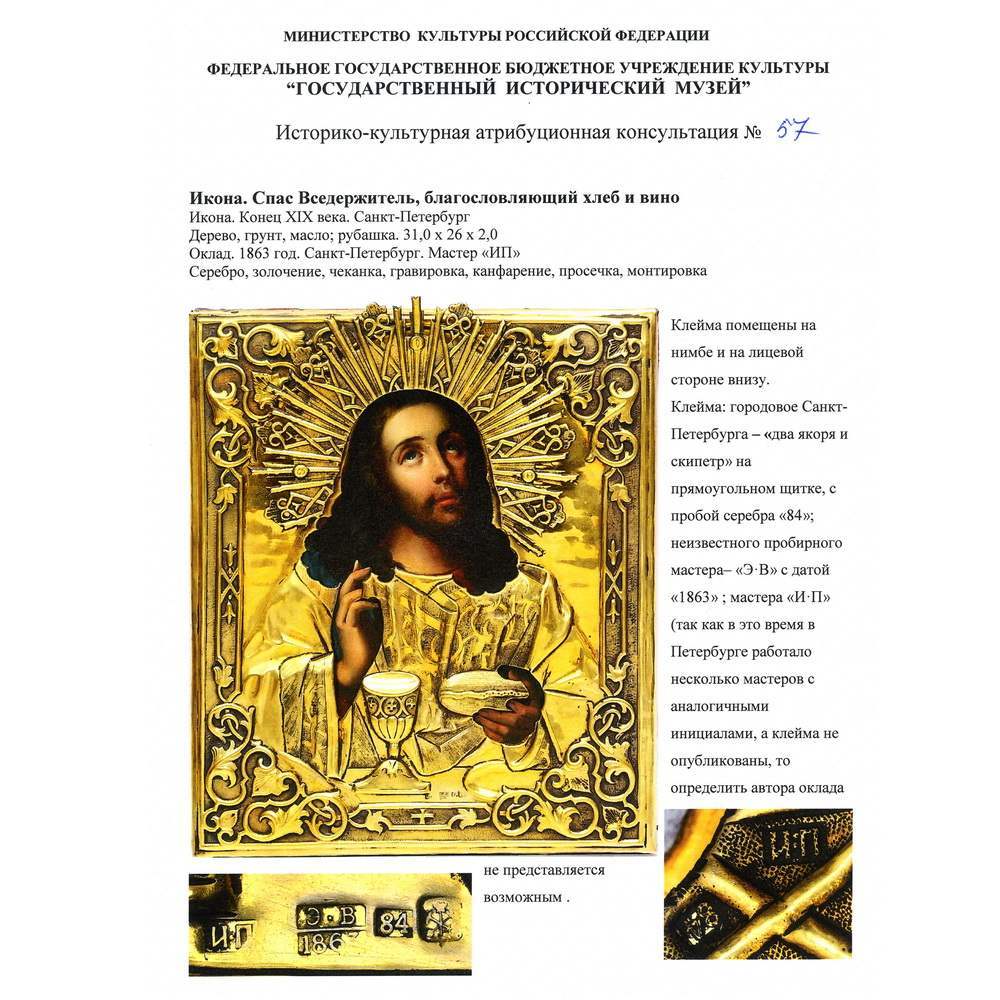 Редкий по иконографии и великолепно исполненный образ «Спас Вседержитель, благословляющий хлеб и вино» середины XIX века, в прекрасном петербургском серебряном окладе 1863 года имеет историко-культурное и музейно-коллекционное значение.