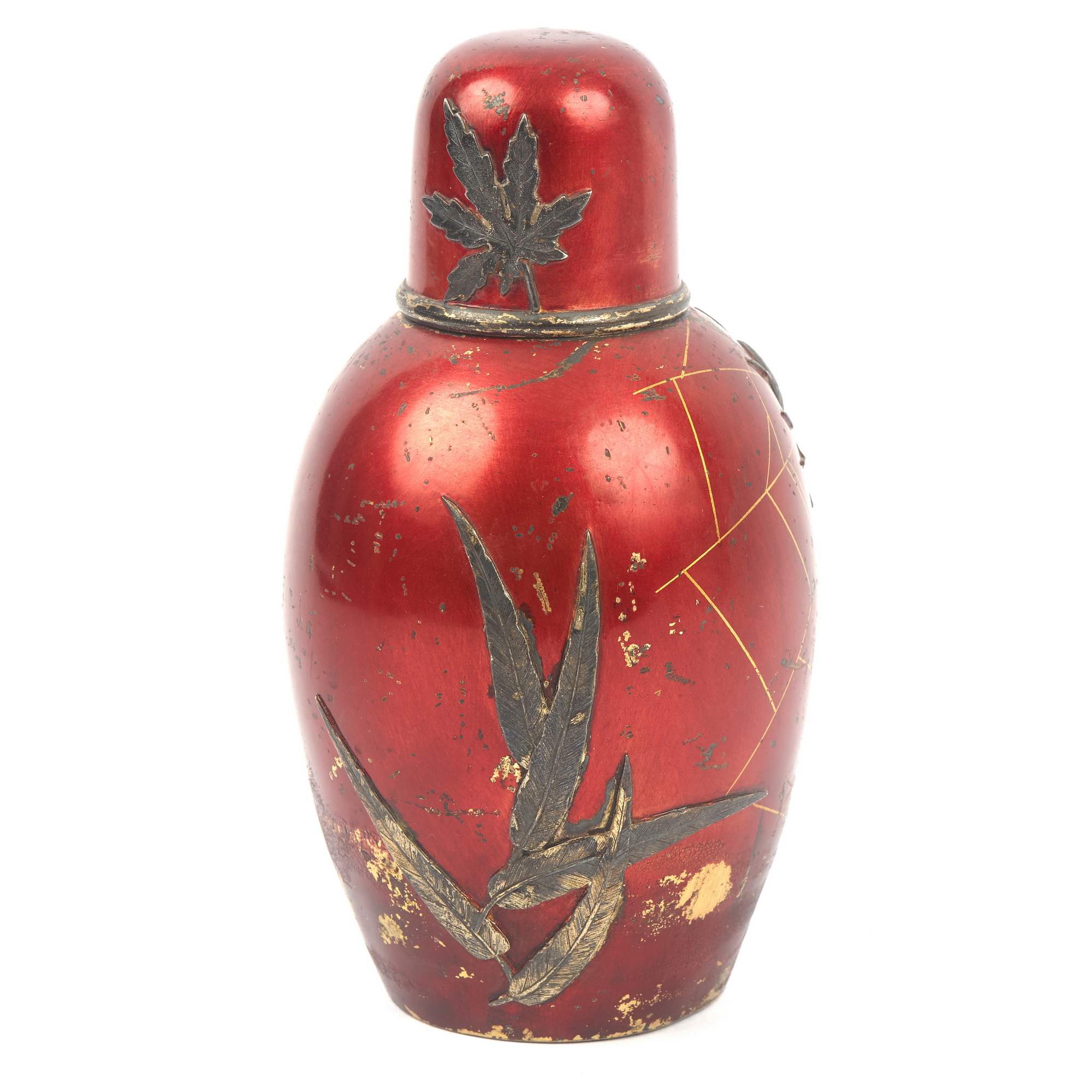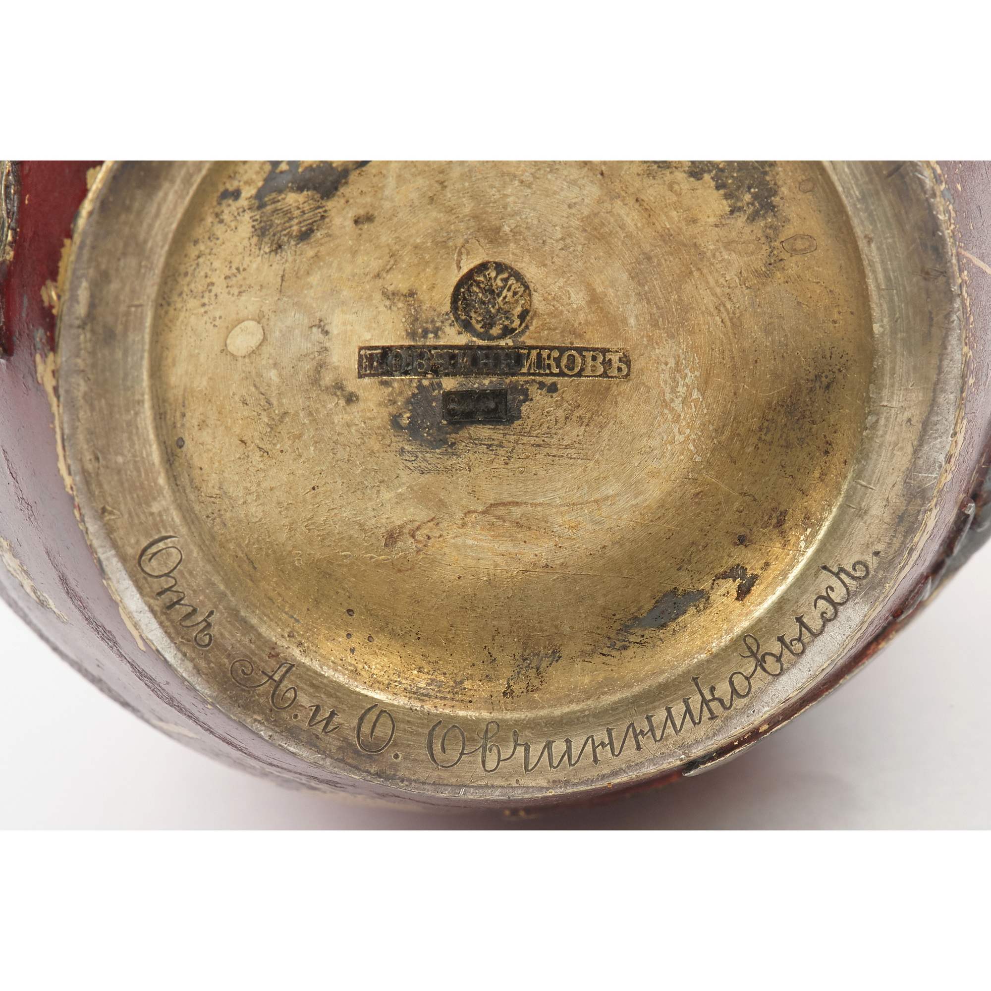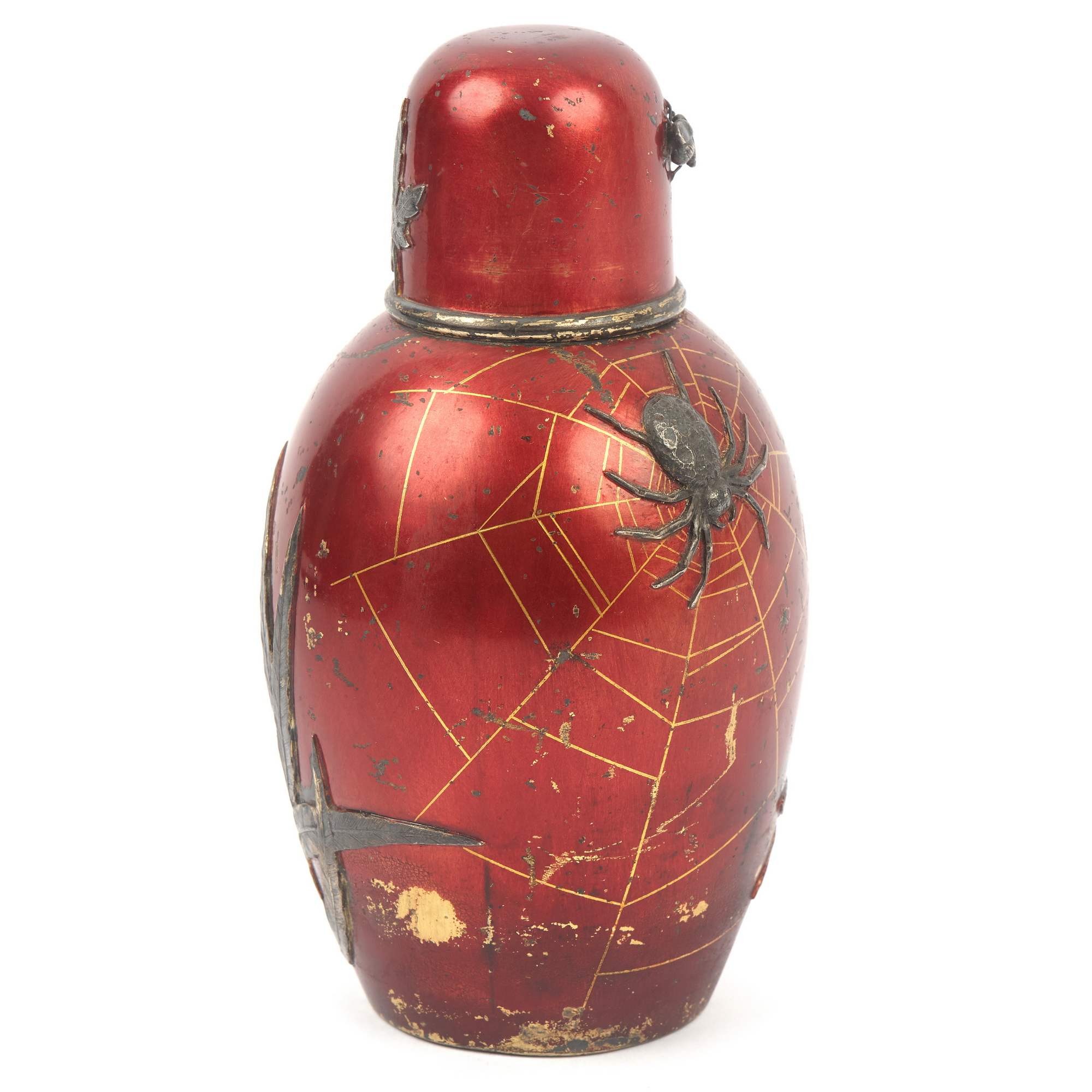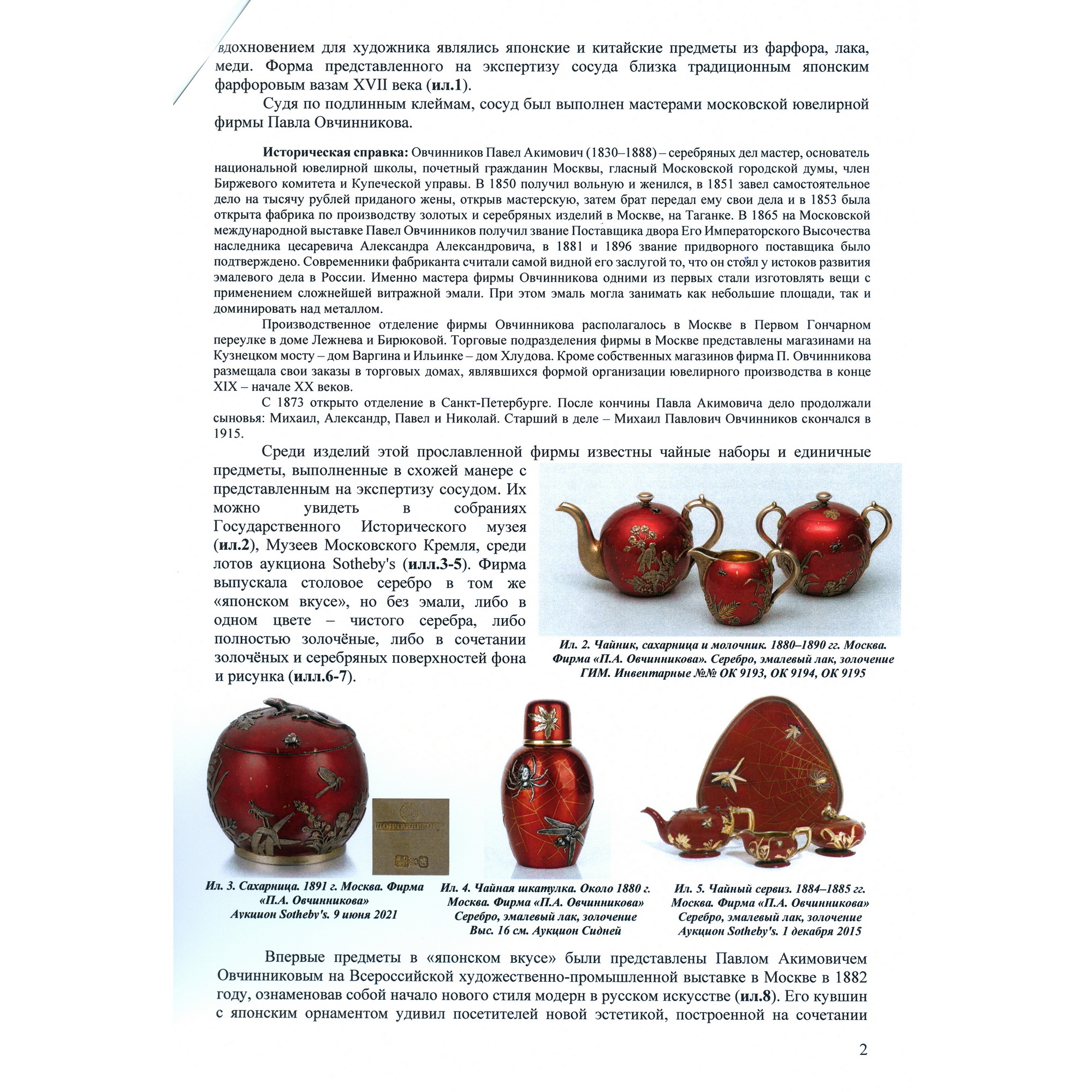 Изумительная чайница работы знаменитой фирмы П. Овчинникова с подлинными клеймами. Великолепный декор изделия ориентирован на китайско-японское искусство. На поверхности, покрытой ярко-красным эмалевым лаком, размещены чеканные изображения водных растений, стрекозы, попавшей сети паука, который размещен ближе к плечикам сосуда в центре золотой паутины. Крышка также украшена эмалевым лаком, чеканным листом японского клена и мушкой. Поражает как сложность задумки, так и отличное мастерство ее исполнения. Линии паутины образованы благодаря фрагментарному заполнению фона эмалевым лаком. Чеканные образы проработаны до мельчайших деталей, их цвет выразительно контрастирует с яркой поверхностью. Изготовлена эта замечательная чайница на знаменитой фабрике Павла Акимовича Овчинникова, чья продукция славилась очень высоким качеством. Произведения фирмы участвовали на всероссийских и всемирных выставках, отмечались высшими наградами, утверждая первенство русских ювелиров. Являясь исполнителями крупных государственных заказов для императорского двора, мастера фирмы во многом стали законодателями моды, зачастую не только продолжая сложившиеся традиции, но и формируя новые тенденции серебряного и золотого дела второй половины XIX – начала XX века. Одним из востребованных и популярных веяний в конце XIX века стало увлечение искусством Японии в частности и Дальнего Востока в целом. Предметы, выполненные фирмой П. Овчинникова в схожей с представленной чайницей манере можно увидеть в собраниях Государственного Исторического музея, Музеев Московского Кремля, в крупных частных собраниях. Однако у данной чайницы есть уникальная черта - дарственная надпись «От А и О Овчинниковых». У Павла Акимовича было четыре сына. Один из них - Александр Павлович - заведовал московским отделением фирмы и магазином в Москве. Тот факт, что на подлинном клейме есть московский герб, позволяет сделать вывод, что эта великолепная чайница была подарена некоему лицу одним из сыновей знаменитого ювелира - одним из наследных владельцев фирмы, продолживших дело Павла Акимовича Овчинникова, ничуть не преуменьшив его замечательное наследие. Инициал «О» вероятно принадлежал супруге Александра Павловича Овчинникова, подробной информации о ней на сегодняшний день установить не удалось.
