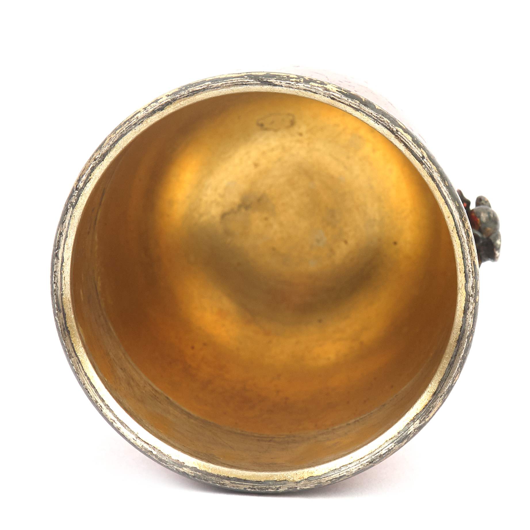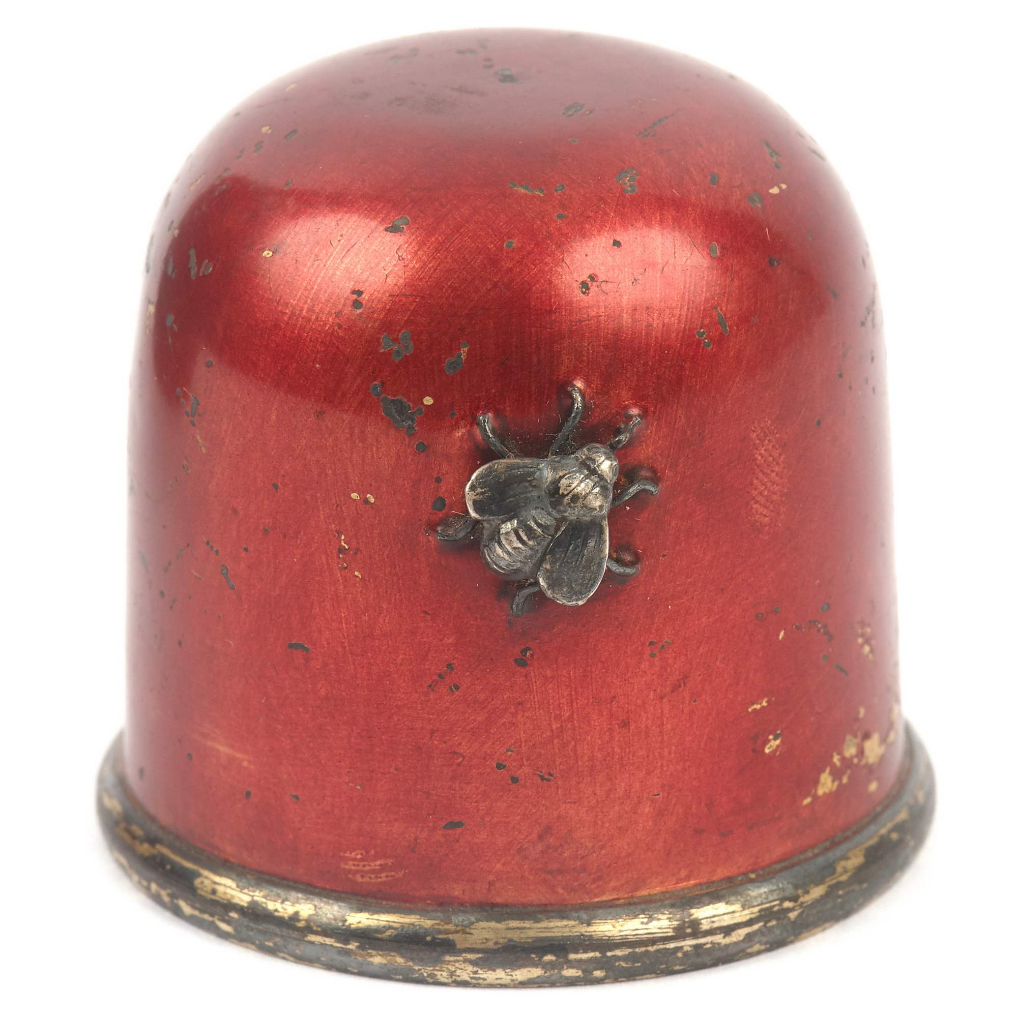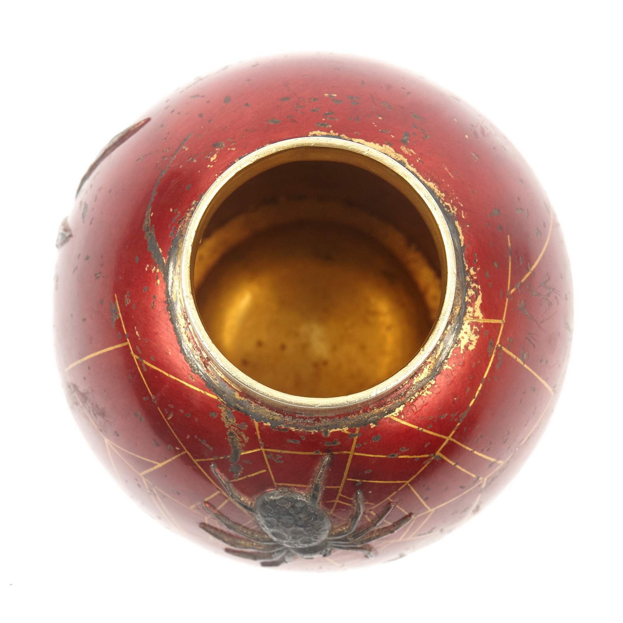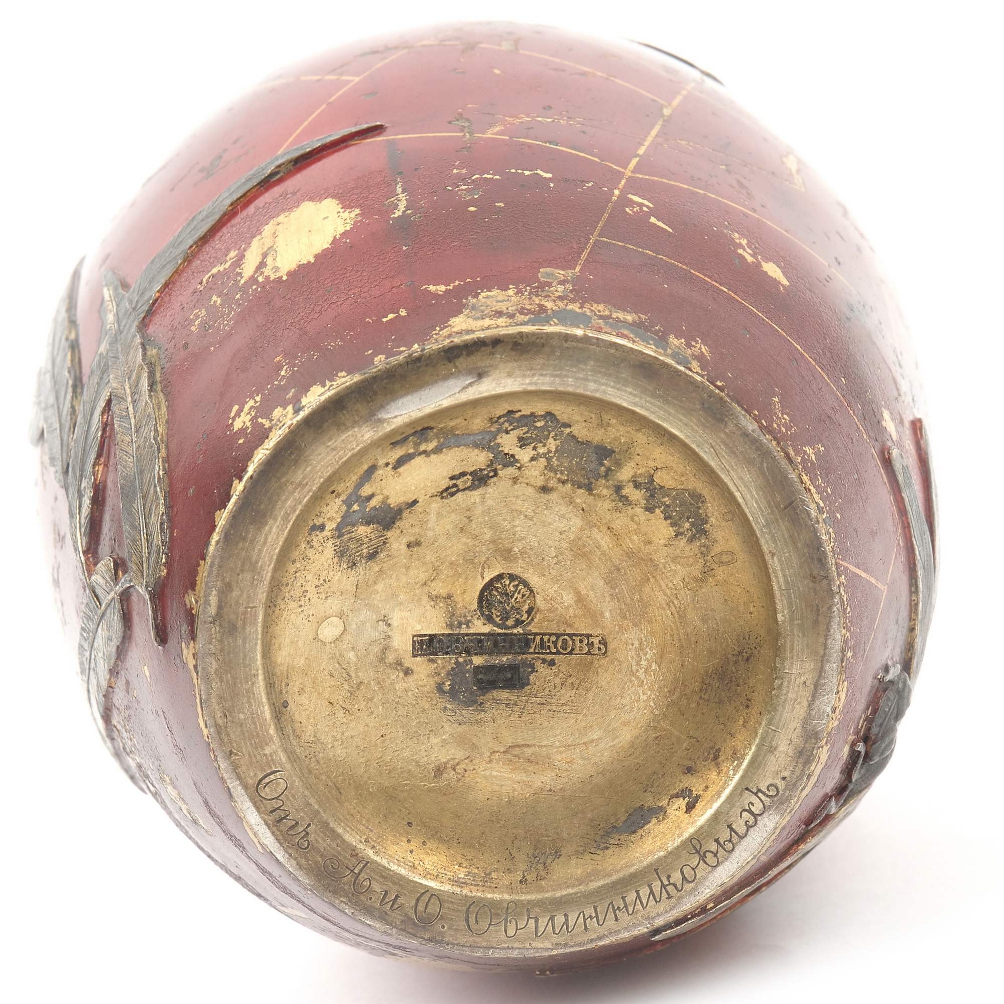 Изумительная чайница работы знаменитой фирмы П. Овчинникова с подлинными клеймами. Великолепный декор изделия ориентирован на китайско-японское искусство. На поверхности, покрытой ярко-красным эмалевым лаком, размещены чеканные изображения водных растений, стрекозы, попавшей сети паука, который размещен ближе к плечикам сосуда в центре золотой паутины. Крышка также украшена эмалевым лаком, чеканным листом японского клена и мушкой. Поражает как сложность задумки, так и отличное мастерство ее исполнения. Линии паутины образованы благодаря фрагментарному заполнению фона эмалевым лаком. Чеканные образы проработаны до мельчайших деталей, их цвет выразительно контрастирует с яркой поверхностью. Изготовлена эта замечательная чайница на знаменитой фабрике Павла Акимовича Овчинникова, чья продукция славилась очень высоким качеством. Произведения фирмы участвовали на всероссийских и всемирных выставках, отмечались высшими наградами, утверждая первенство русских ювелиров. Являясь исполнителями крупных государственных заказов для императорского двора, мастера фирмы во многом стали законодателями моды, зачастую не только продолжая сложившиеся традиции, но и формируя новые тенденции серебряного и золотого дела второй половины XIX – начала XX века. Одним из востребованных и популярных веяний в конце XIX века стало увлечение искусством Японии в частности и Дальнего Востока в целом. Предметы, выполненные фирмой П. Овчинникова в схожей с представленной чайницей манере можно увидеть в собраниях Государственного Исторического музея, Музеев Московского Кремля, в крупных частных собраниях. Однако у данной чайницы есть уникальная черта - дарственная надпись «От А и О Овчинниковых». У Павла Акимовича было четыре сына. Один из них - Александр Павлович - заведовал московским отделением фирмы и магазином в Москве. Тот факт, что на подлинном клейме есть московский герб, позволяет сделать вывод, что эта великолепная чайница была подарена некоему лицу одним из сыновей знаменитого ювелира - одним из наследных владельцев фирмы, продолживших дело Павла Акимовича Овчинникова, ничуть не преуменьшив его замечательное наследие. Инициал «О» вероятно принадлежал супруге Александра Павловича Овчинникова, подробной информации о ней на сегодняшний день установить не удалось.