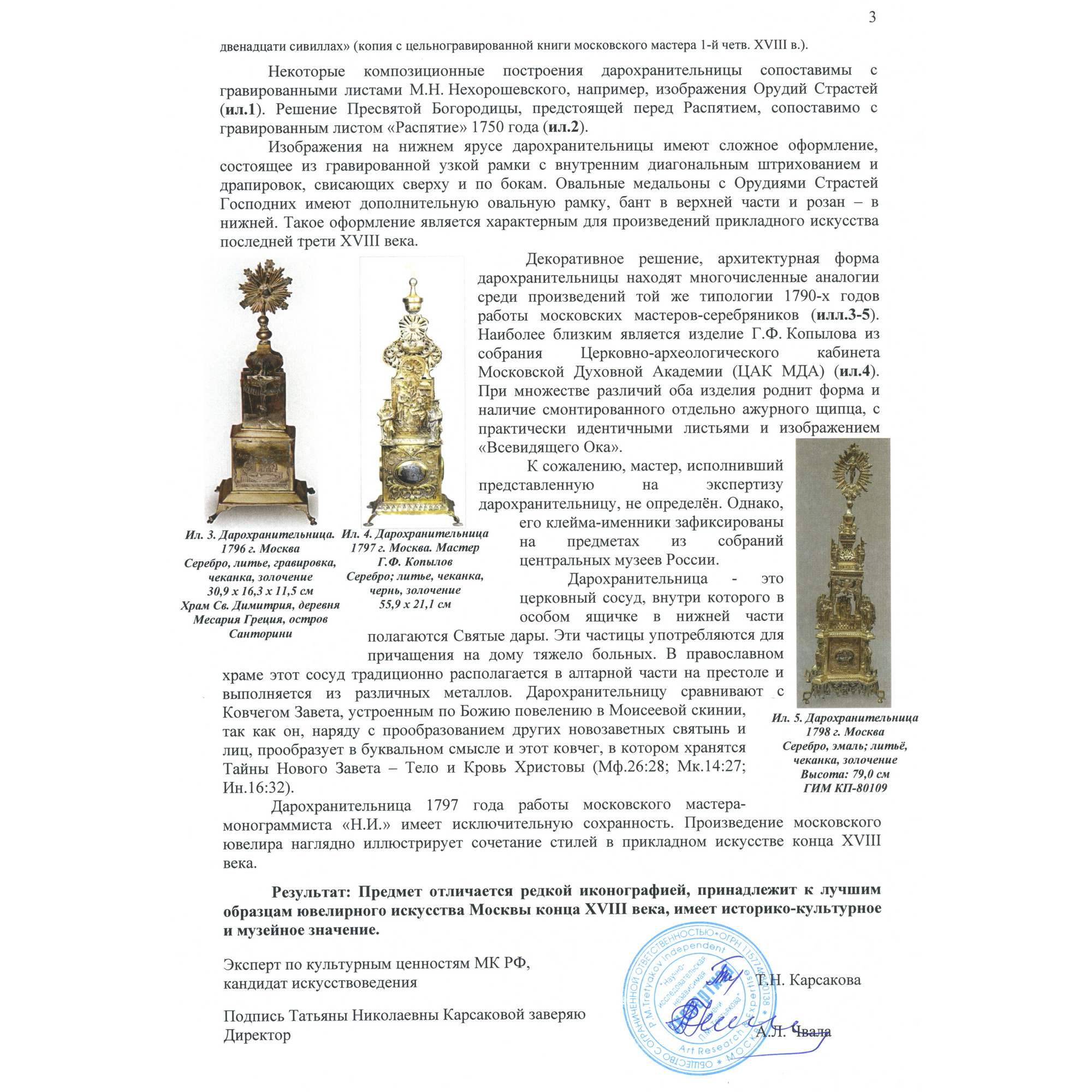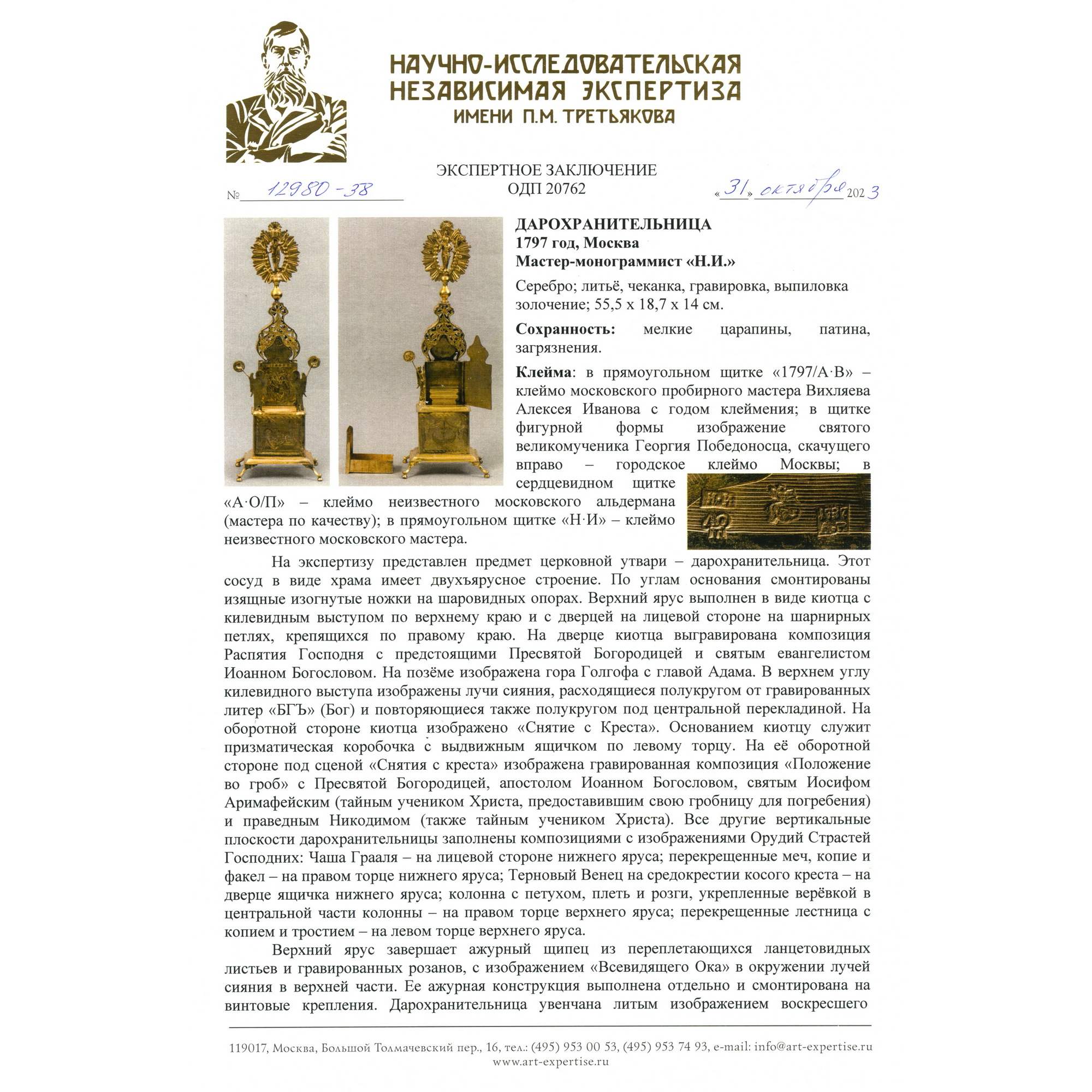 Уникальный памятник декоративно - прикладного искусства. Дарохранительница - редкий образец творчества московских мастеров серебряного дела, конца 18-го века. Антиквариат. Хорошая сохранность.