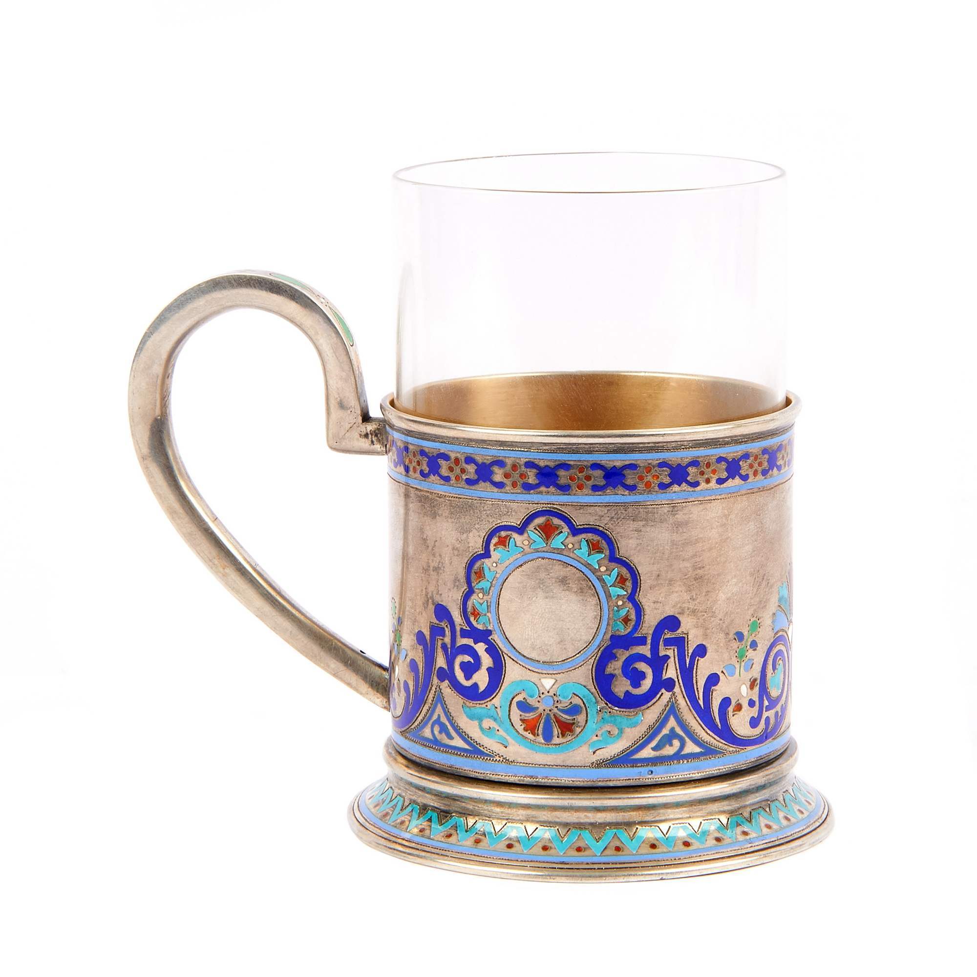 Редкий старинный, коллекционный подстаканник с выемчатой эмалью. Изготовлен знаменитой фирмой Хлебникова. Хлебниковь - одна из лучших ювелирных фирм царской России, имела звание Придворного Поставщика. Их изделия по праву украшают многие коллекции и крупнейшие музейные собрания.