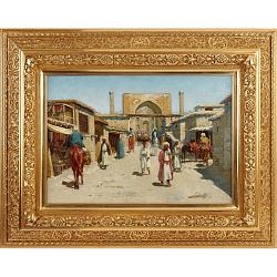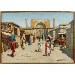 Великолепная картина с изображением торговой улицы в Самарканде кисти знаменитого русского художника Рихарда Карловича Зоммера. Городской пейзаж исполнен искуснейшим образом. Изображенная улица полна людей в характерных национальных одеждах. Фигуры грамотно ориентированы в пространстве, что свидетельствует о свободном владении художника приемами построения композиции. При этом, весьма впечатляет разнообразие персонажей: кто-то идет навстречу зрителю, кто-то устремляется вдаль от него, купцы везут товары, используя верховых животных, а торговцы сидят за прилавками под тряпичными навесами, прячась от палящего солнца. Глядя на представленную картину не возникает никаких сомнений, что автор ее - Рихард Карлович Зоммер - воочию видел красоты восточного мира, воплощая в своих работах увиденное им прямо на улицах Самарканда. Стоит отметить, что Зоммер является признанным мастером живописи, одним из ведущих и узнаваемых представителей русского ориентализма - направления, посвященного изображению Востока. Он получил блестящее образование в Императорской Академии художеств Петербурга, неоднократно удостаивался престижных наград. В 1915 году в Ташкенте была проведена персональная прижизненная выставка художника. Рихард Карлович лично много путешествовал по Средней Азии, многое из увиденного запечатлел на своих полотнах. Его замечательные работы сродни визуальной хронике документируют реальную жизнь жителей востока, их быт и культуру. Высший уровень достоверности вкупе с немалым живописным талантом делает картины художника по-настоящему уникальным явлением. Большая часть картин Зоммера находится в музеях и частных собраниях, как русских, таких как ГРМ, так и зарубежных. Изображенный на картине Самарканд -один из важнейших символов Великого шелкового пути, Узбекистана, является желанным "трофеем" среди коллекционеров живописи, посвященной Востоку. На картине Зоммера Самарканд написан еще до реконструкций, советской модернизации и исчезновения старых кварталов, то есть представленное полотно - ценнейший визуальный документ ныне утраченного облика города.