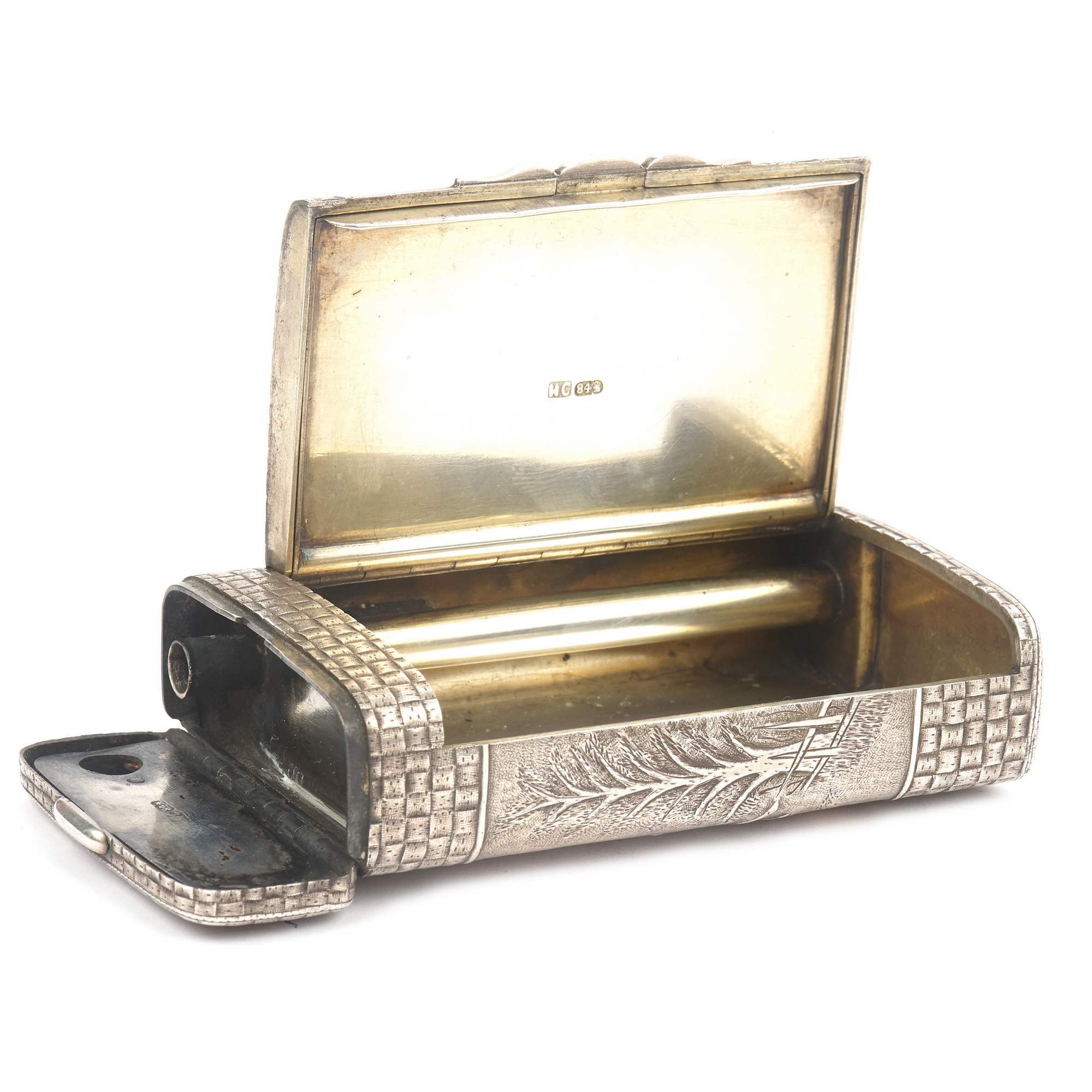 Портсигар имеет несколько отделений, для спичек, для папиросной бумаги, для табака. Клеймо мастера ИС, говорит что, скорее всего данный портсигар был изготовлен мастерами ювелирной фабрики Салтыкова Ивана Дмитриевича. Антиквариат. Хорошая сохранность. Следы бытования.