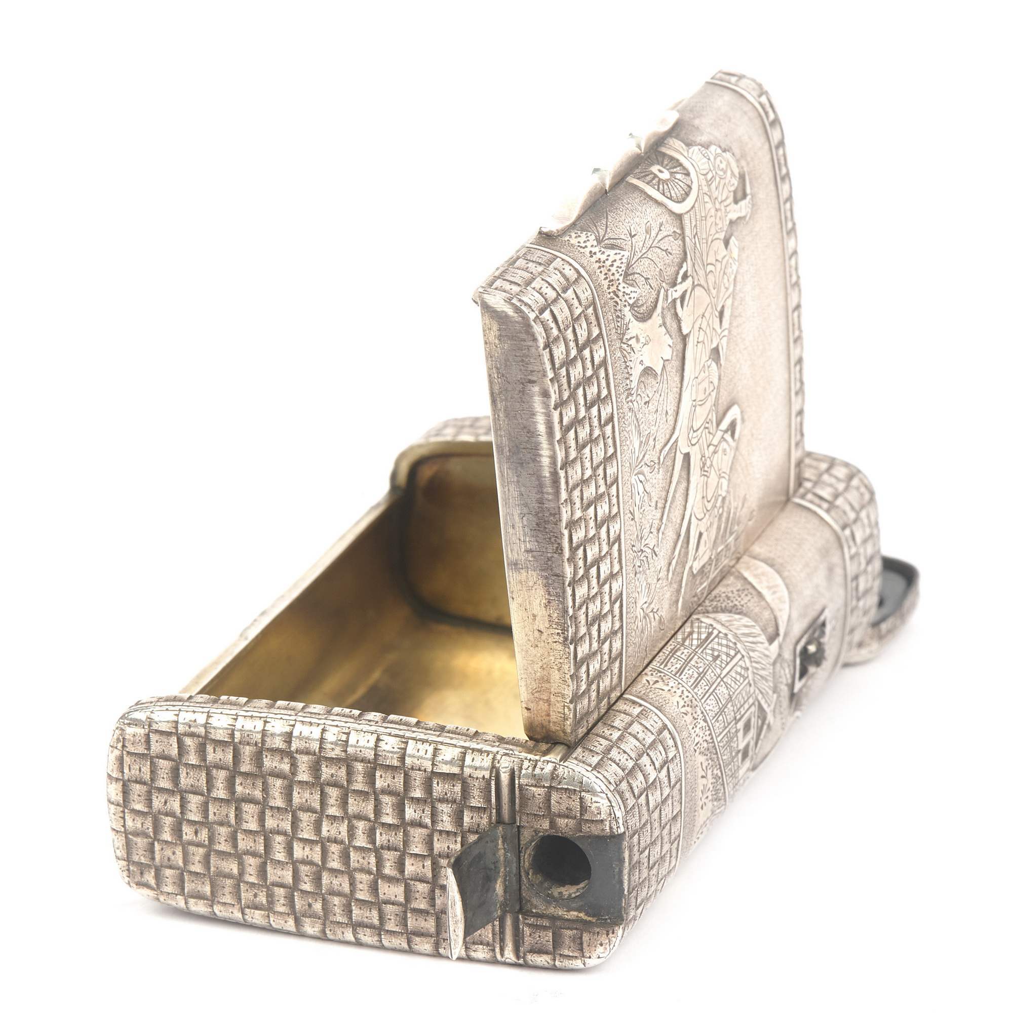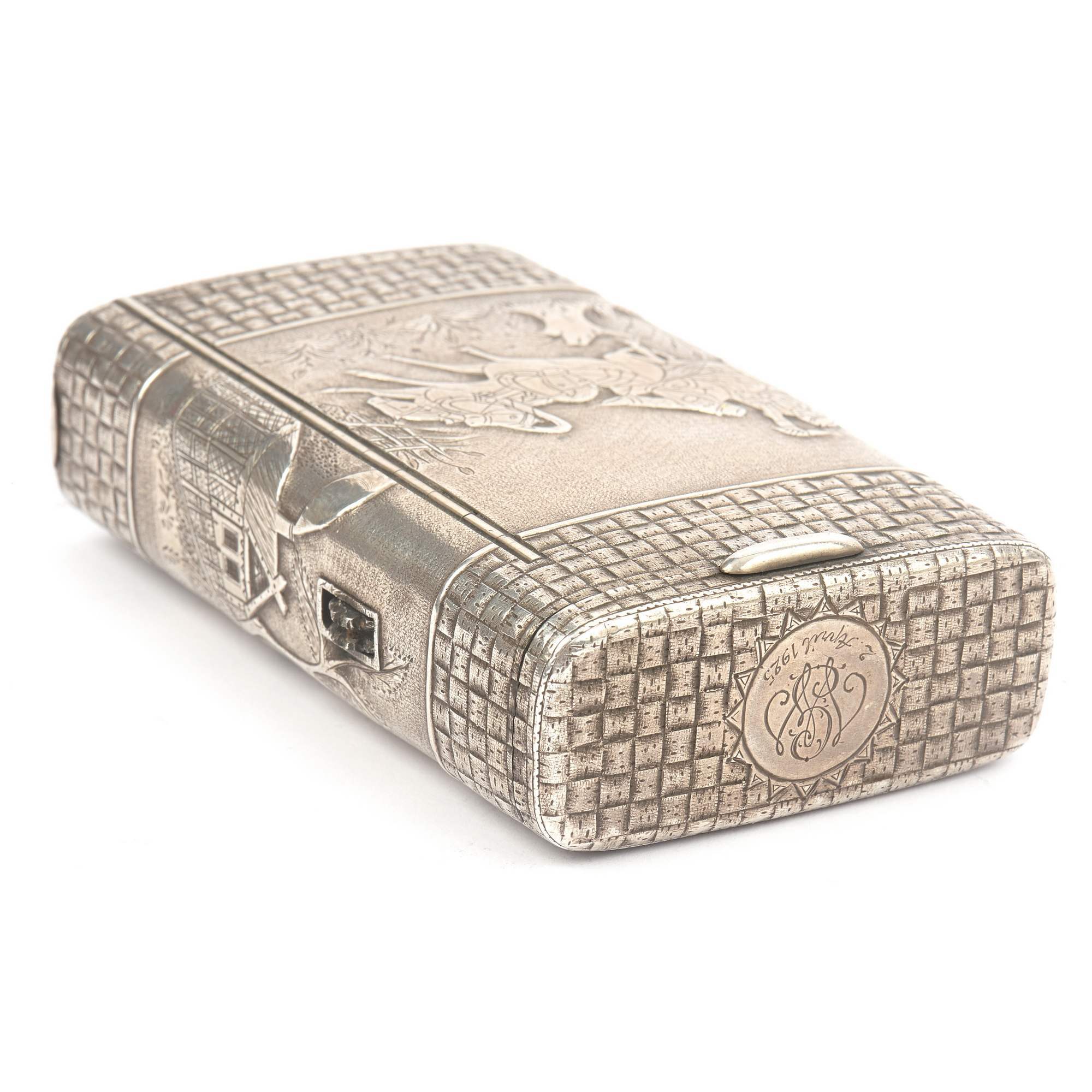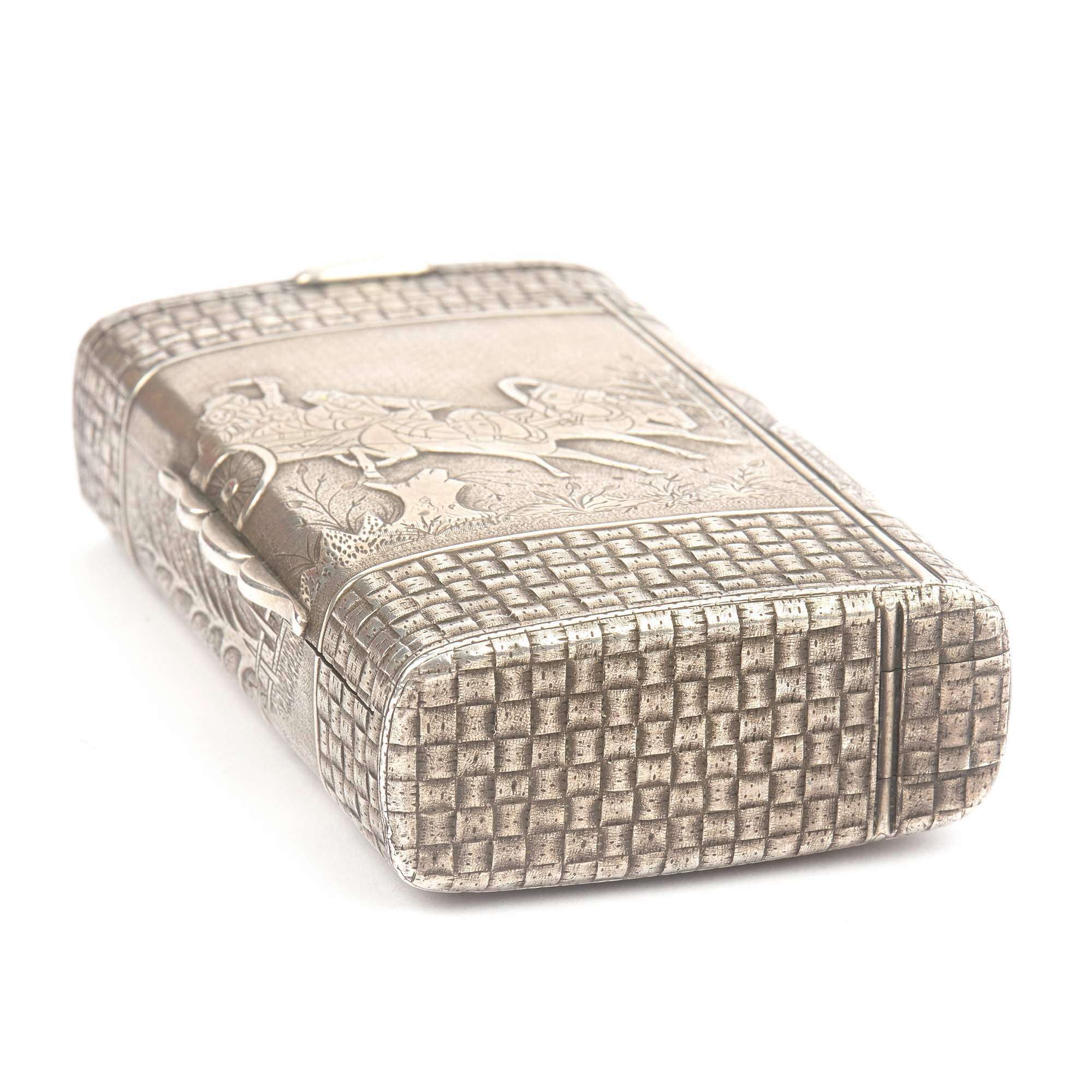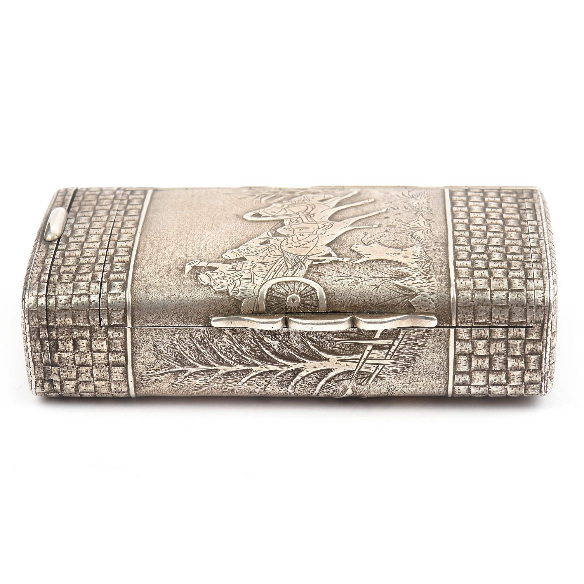 Редкий, старинный коллекционный портсигар «Русская тройка». Портсигар очень массивный. Вся его поверхность украшена чеканным орнаментом под плетеное «лыко». Такая техника называется «тромплей» - обманка. Миниатюры с мастерски исполненными сценками сельской жизни украшают портсигар со всех сторон.