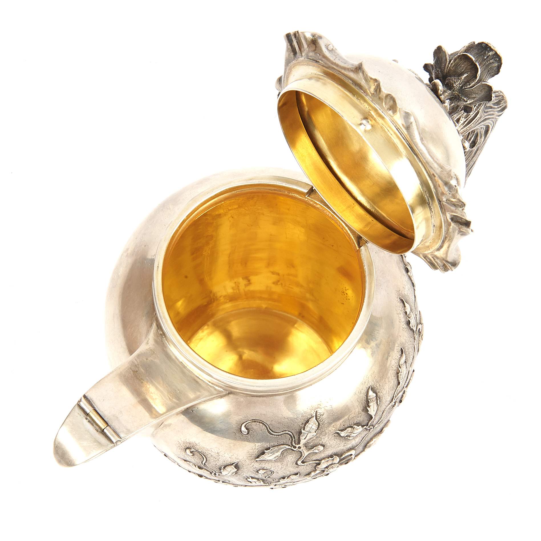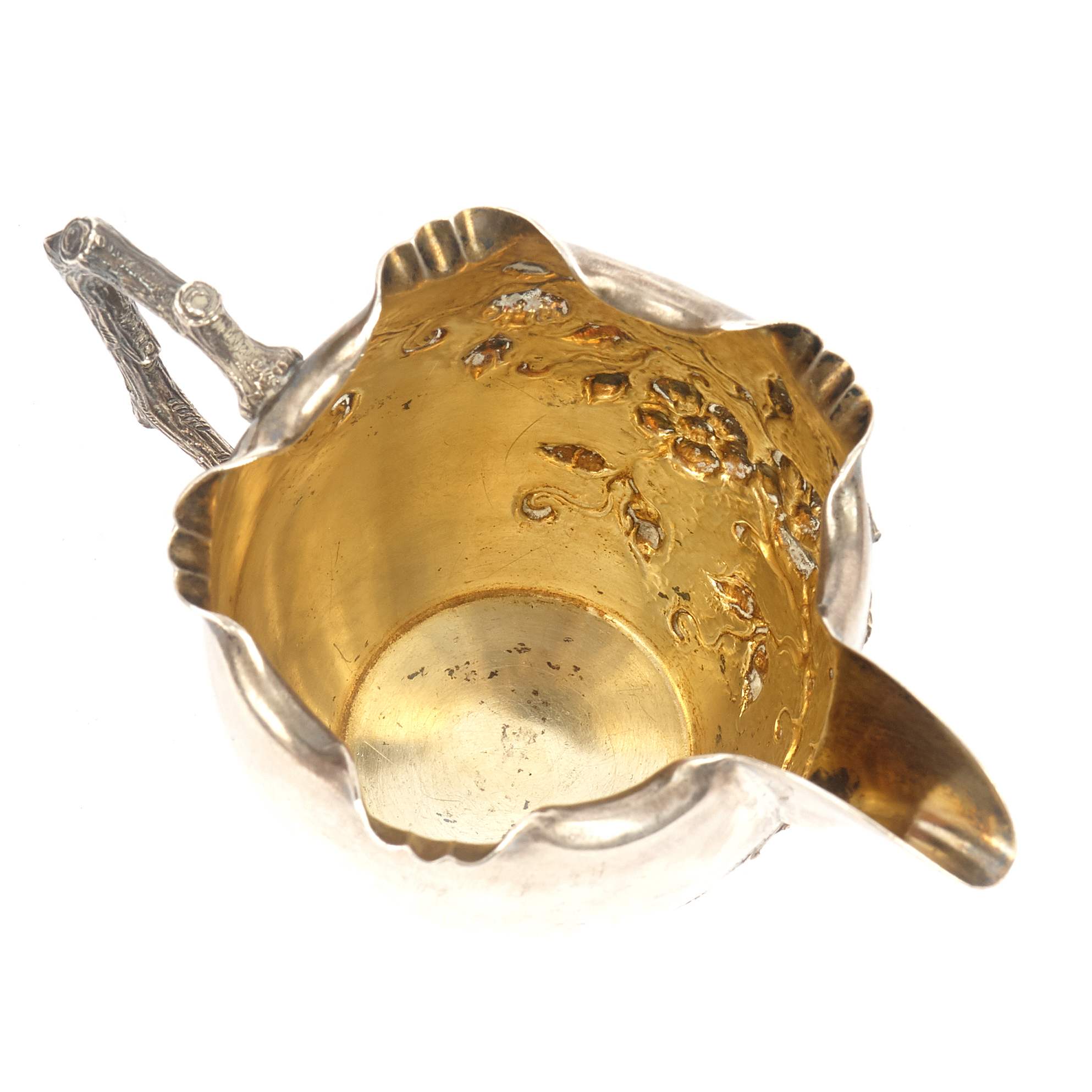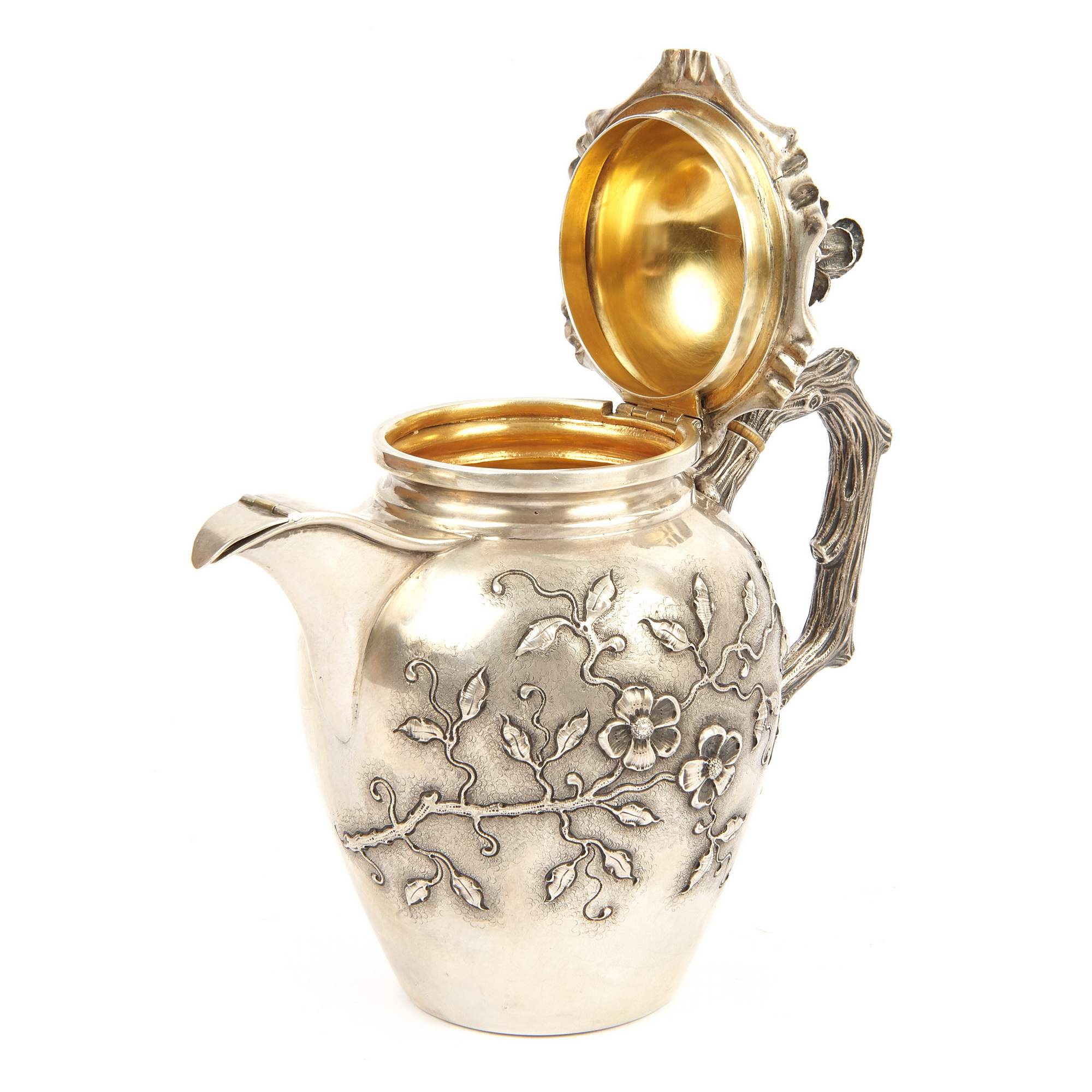 Изящный, очень красивый, старинный чайно - кофейный сервиз "Яблоневый цвет". Сервиз состоит из 4-х предметов, включая поднос, необычной треугольной формы. Поверхность предметов украшена цветущими ветками яблони. Также ручки предметов исполнены в виде веточек. Ручка кофейника снабжена перемычками из слоновой кости, чтобы не обжигаться. Внутренняя поверхность предметов покрыта золотом. Антиквариат. Хорошая сохранность.