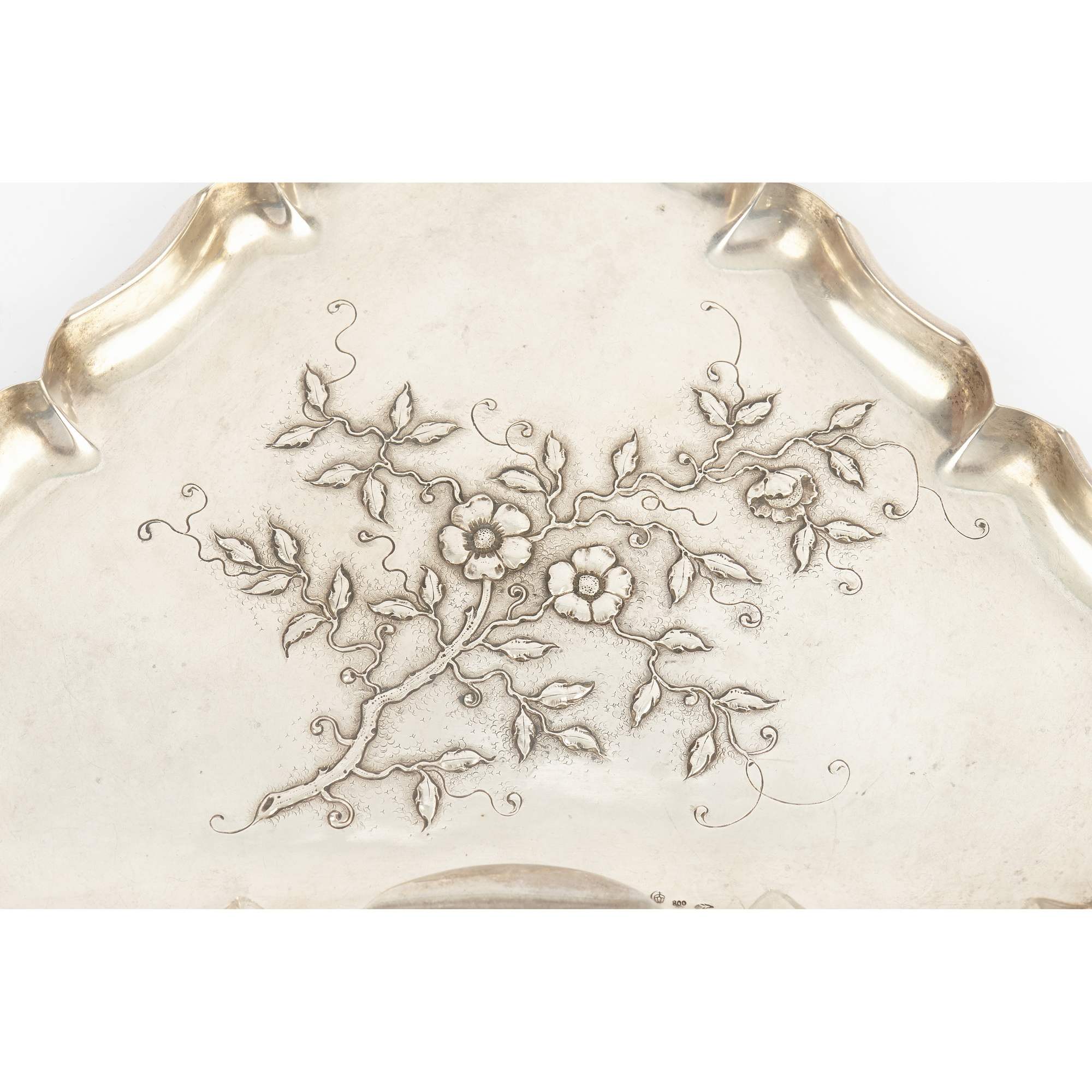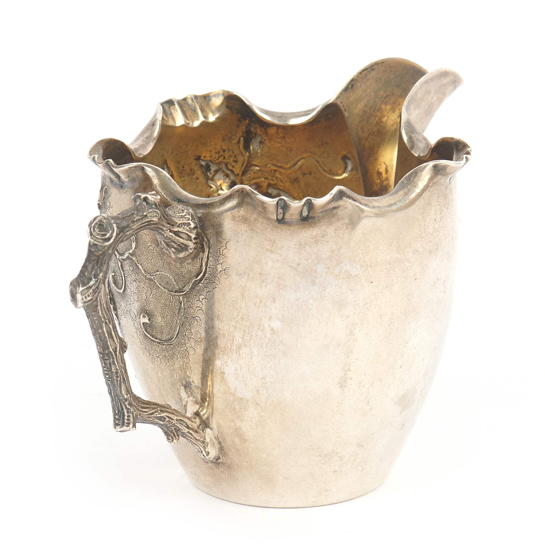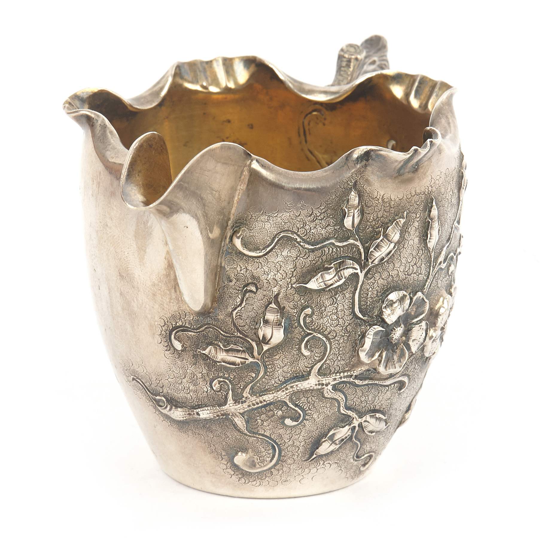 Изящный, очень красивый, старинный чайно - кофейный сервиз "Яблоневый цвет". Сервиз состоит из 4-х предметов, включая поднос, необычной треугольной формы. Поверхность предметов украшена цветущими ветками яблони. Также ручки предметов исполнены в виде веточек. Ручка кофейника снабжена перемычками из слоновой кости, чтобы не обжигаться. Внутренняя поверхность предметов покрыта золотом. Антиквариат. Хорошая сохранность.