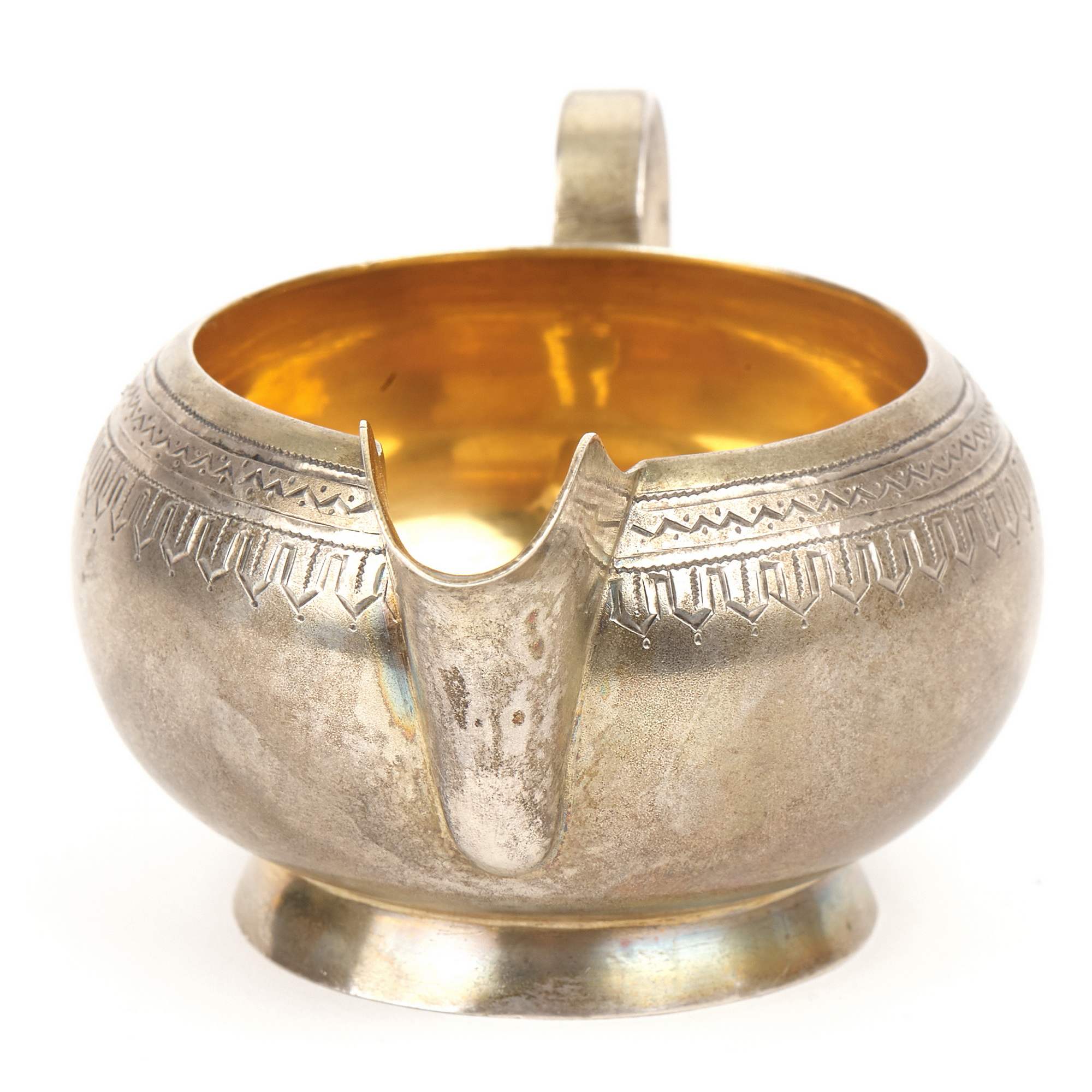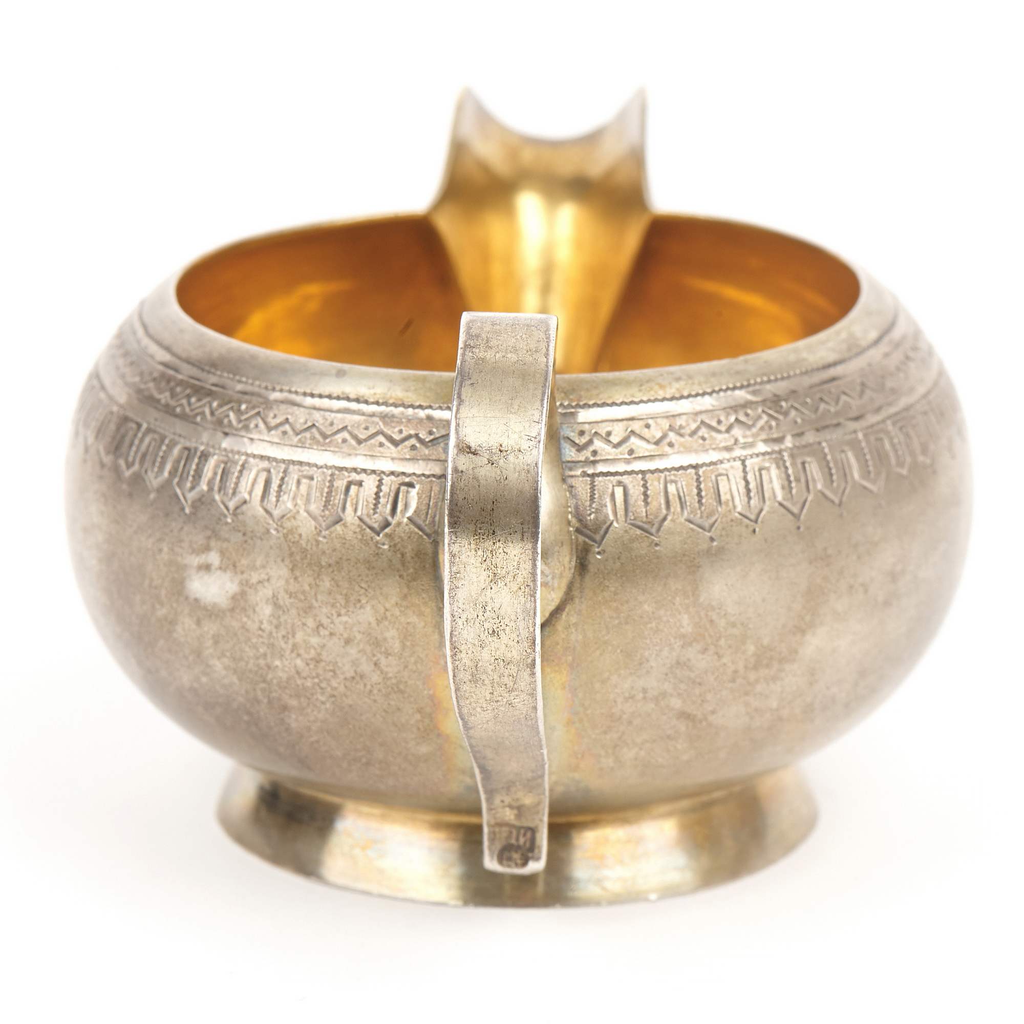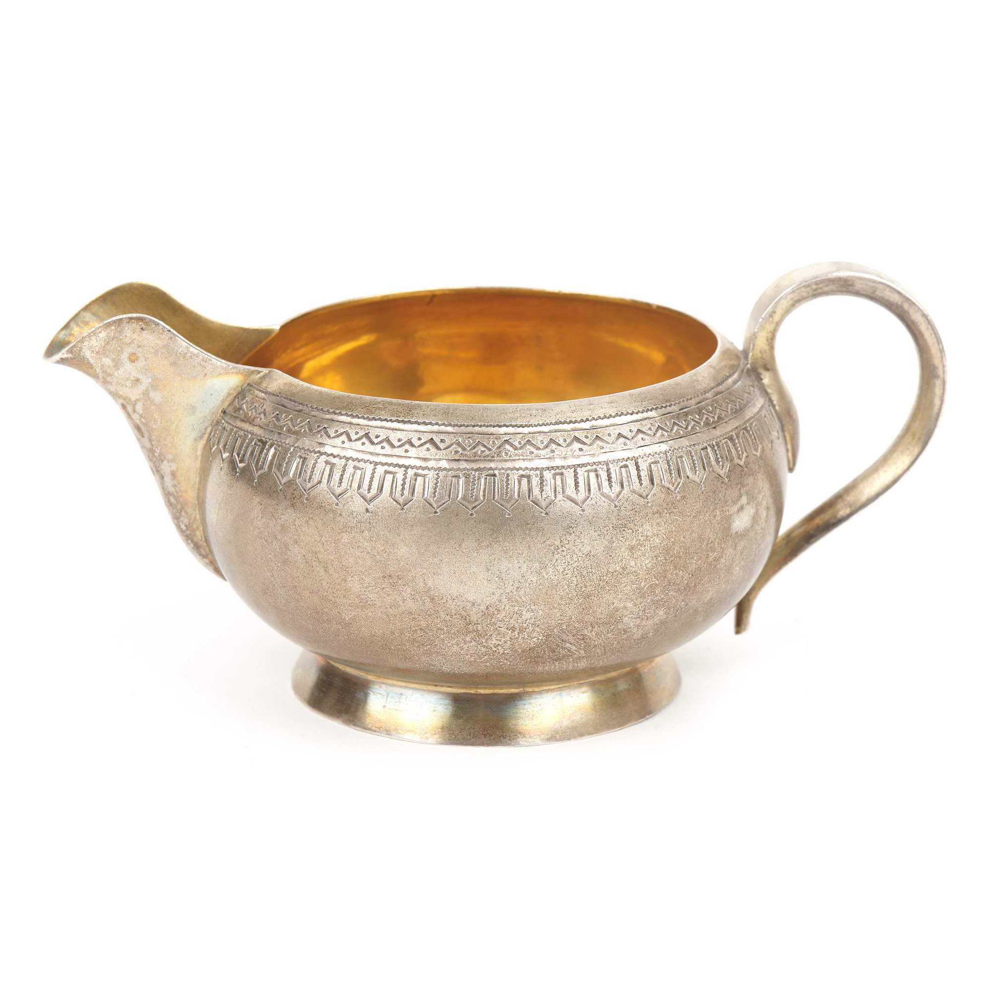 Замечательный, «пузатенький», старинный сливочник, выполненный из царского серебра 84 (она же 875 метрическая) пробы. Утилитарные предметы зачастую не вызывают бурного восхищения, между тем именно простые, удобные и красивые вещи заслуживают любви и внимания. Мастер, создавая простой сливочник, в первую очередь думал не о собственном гении и увековечивании оного, а о человеке, который будет этим предметом пользоваться – форма носика, ручки, основание и основной объем, все подчинено этой мысли. Гармония красоты и утилитарности и образует декоративно-прикладное искусство, частью которого, без сомнения, является представленный предмет. Его бортик украшен тканным орнаментом, что позволяет отнести изделие к «русскому стилю», уникальному явлению искусства и любимому многими коллекционерами стилю. Антиквариат. Отличная сохранность.