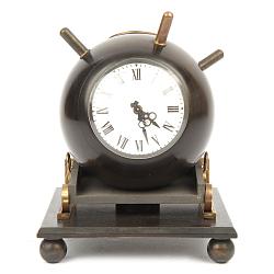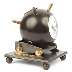 Редкий, занятный предмет. Яркий образец советского представительского искусства, кабинетные часы в виде морской мины на специальной тележке для сбрасывания и установки мины на нужной глубине. Для изготовления подобных спец. подарков в СССР работали специальные цеха. Часы изготовлены на высоком техническом и художественном уровне. Снабжены электрическим механизмом питающимся от эл. батареи. Впечатляет качество изготовления деталей корпуса, уровень подгонки деталей. Подобные изделия выступали в качестве памятного подарка заслуженным людям страны; министрам, адмиралам, ученым. Могли быть подарены высоким иностранным гостям.