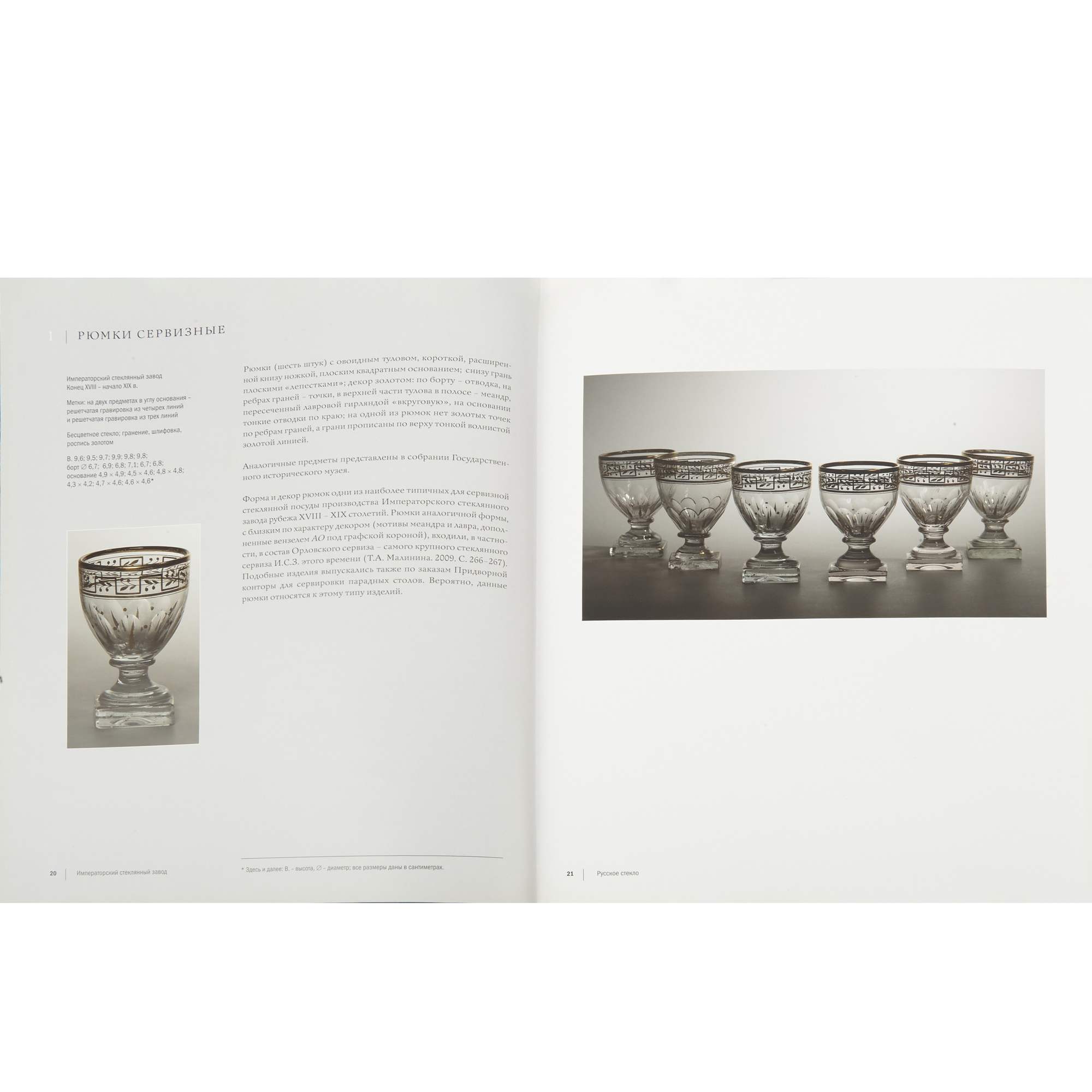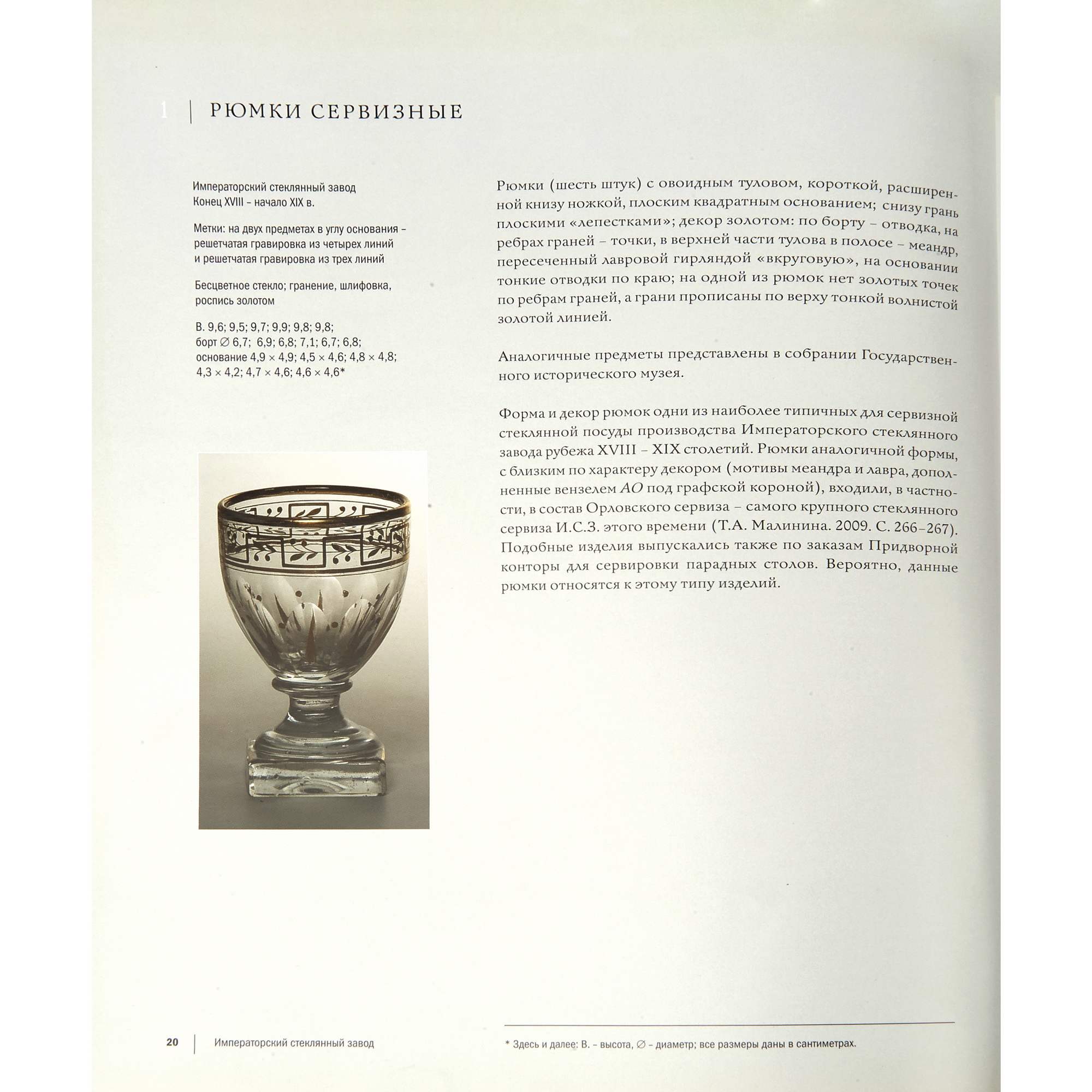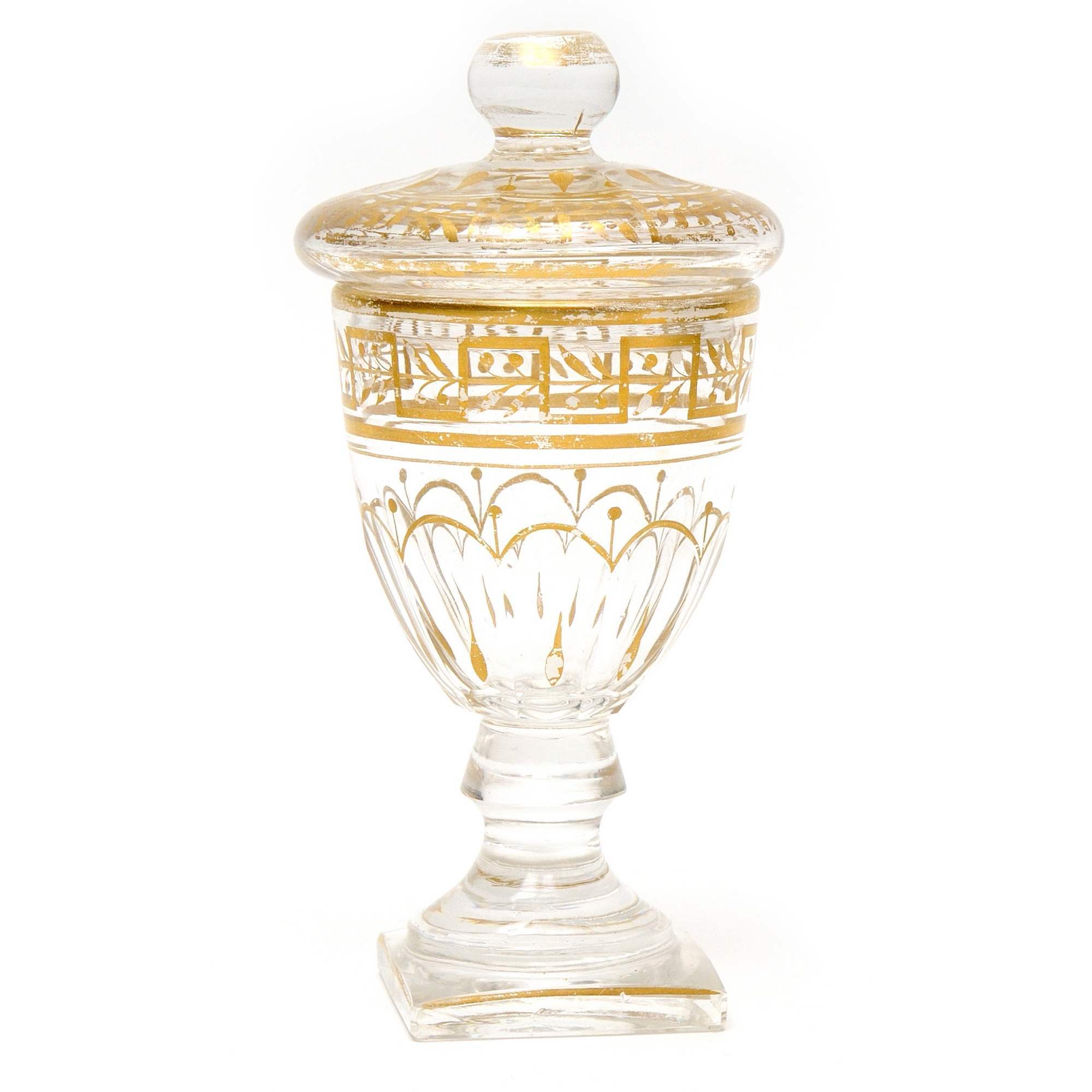 Редкая красивая старинная рюмка с крышкой для крепких напитков. Яркий образец продукции Императорского стекольного завода рубежа 18-19-х веков. В пользу этого говорит высокий, характерный уровень огранки изделия и тонкая роспись золотом по тулову и крышке рюмки. Рюмки аналогичной формы, с близким по характеру декором ( мотивы меандра и лавра, с вензелем АО под графской короной ), входили, в частности, в состав Орловского сервиза - самого крупного стеклянного сервиза ИСЗ того времени. ( Т. А. Малинина 2009 г. стр. 266-267 ). Аналогичные предметы представлены в собрании ГИМ. Так же подобные рюмки приводятся в каталоге собрания Г. Ойстрах 2011-го года. Стр. 20-21.