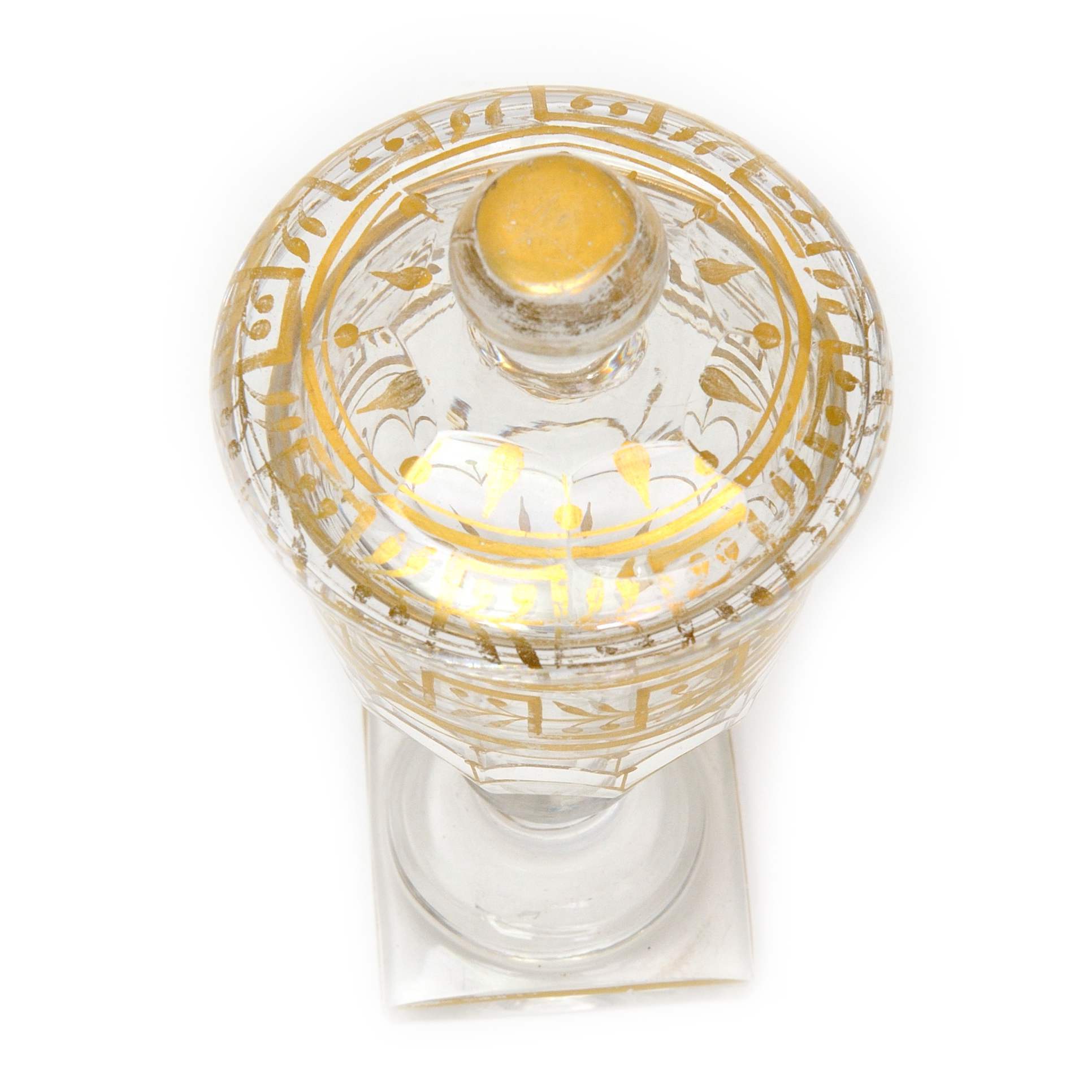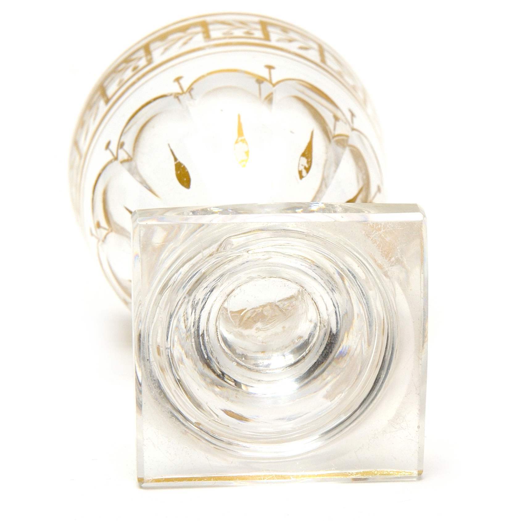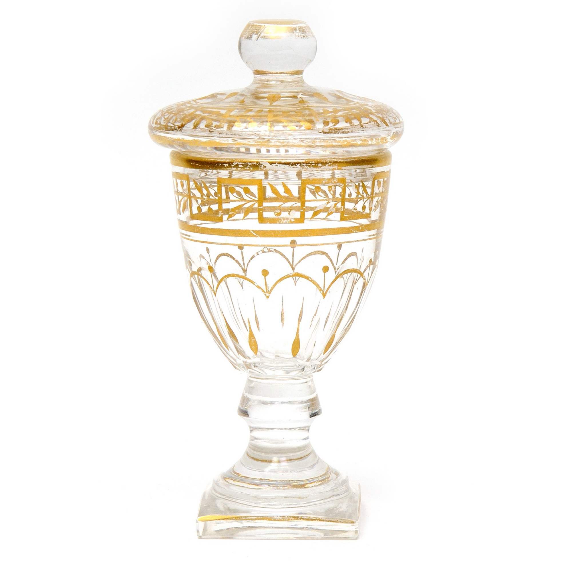 Редкая красивая старинная рюмка с крышкой для крепких напитков. Яркий образец продукции Императорского стекольного завода рубежа 18-19-х веков. В пользу этого говорит высокий, характерный уровень огранки изделия и тонкая роспись золотом по тулову и крышке рюмки. Рюмки аналогичной формы, с близким по характеру декором ( мотивы меандра и лавра, с вензелем АО под графской короной ), входили, в частности, в состав Орловского сервиза - самого крупного стеклянного сервиза ИСЗ того времени. ( Т. А. Малинина 2009 г. стр. 266-267 ). Аналогичные предметы представлены в собрании ГИМ. Так же подобные рюмки приводятся в каталоге собрания Г. Ойстрах 2011-го года. Стр. 20-21.