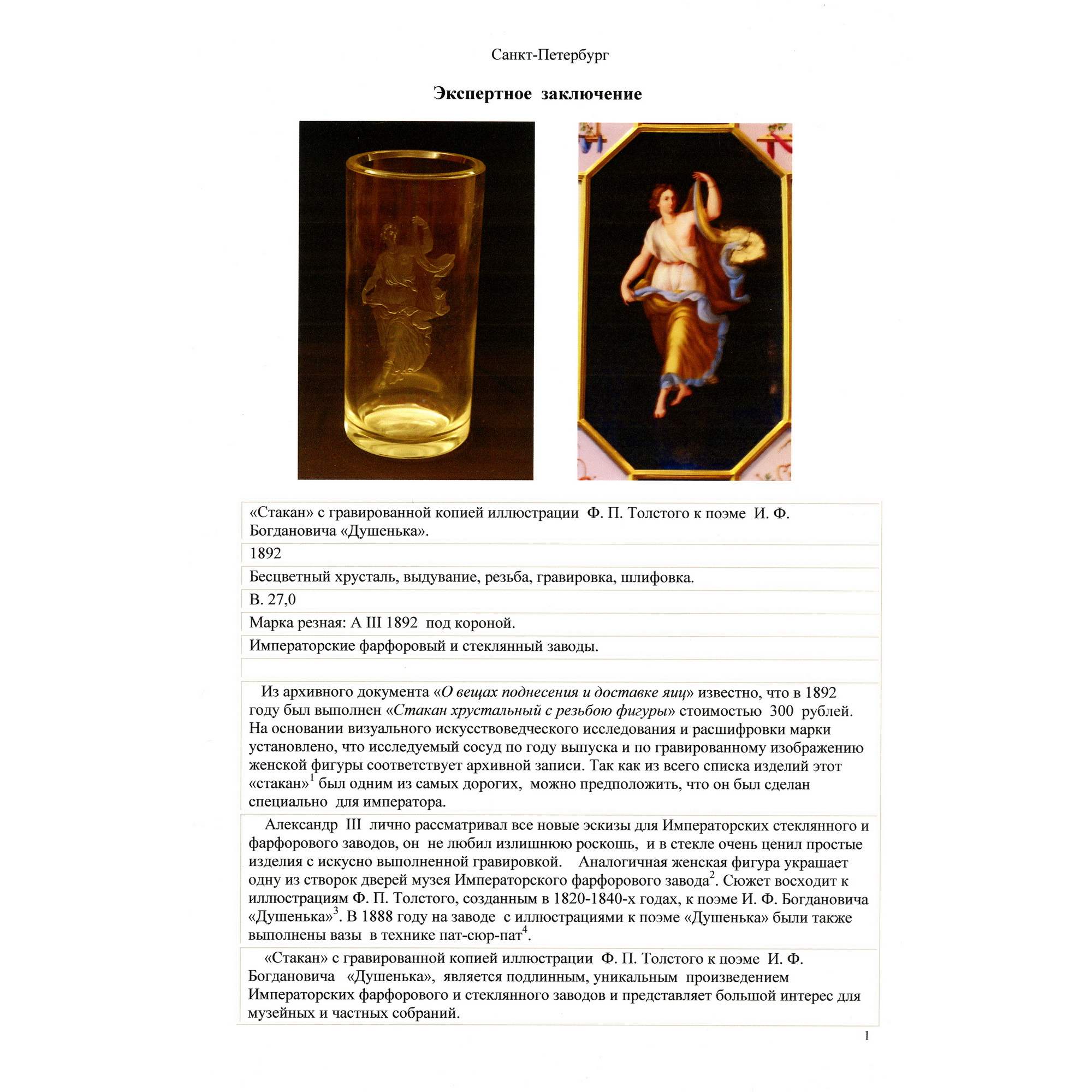 Из архивного документа известно, что в 1892-м году был выполнен заказ «Стакан хрустальный с резьбою фигуры», стоимостью 300 рублей. Данный стакан был один из самых дорогих, скорее всего был сделан специально для императора Александра Третьего. Александр 3 лично рассматривал все новые эскизы для ИСЗ и ИФЗ, и в стекле очень ценил простые изделия с искусной гравировкой, особенно с русскими сюжетами. Аналогичная женская фигура украшает одну из створок дверей музея ИФЗ. Данная ваза является подлинным, уникальным произведением ИСЗ, имеет музейное значение.