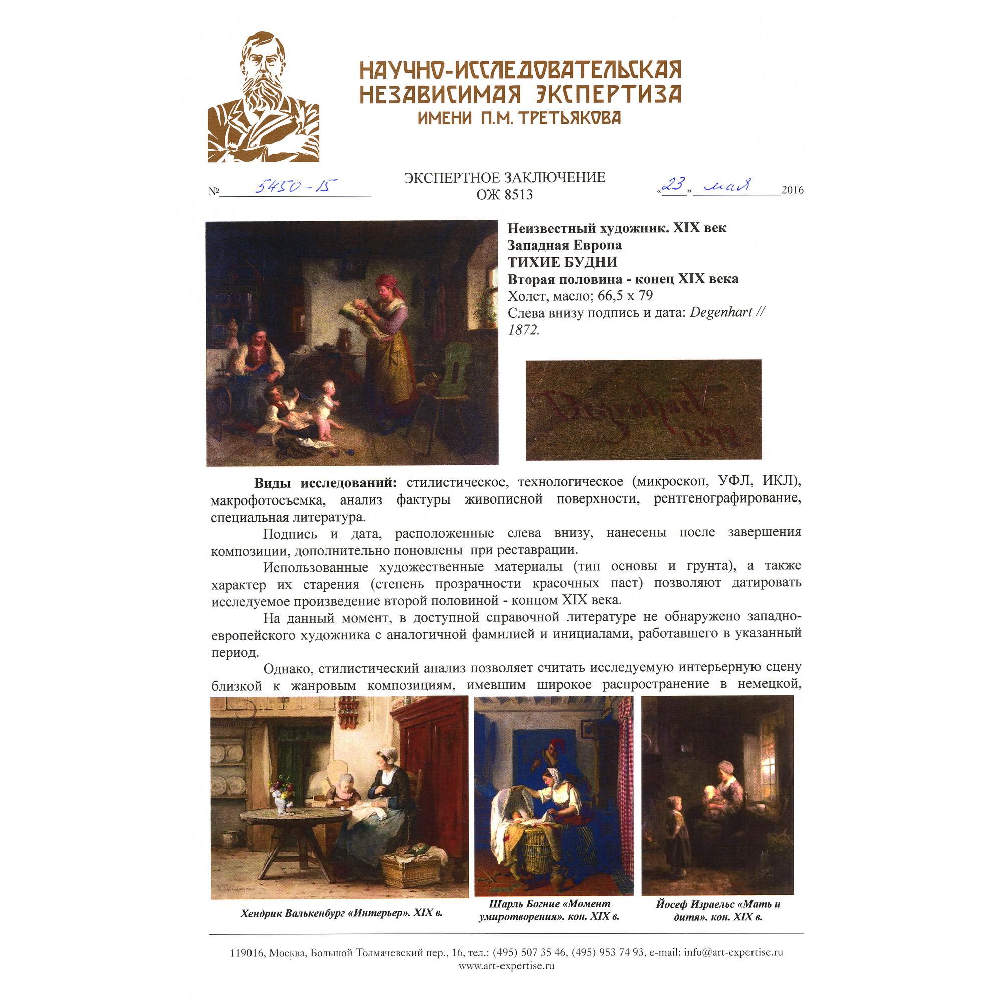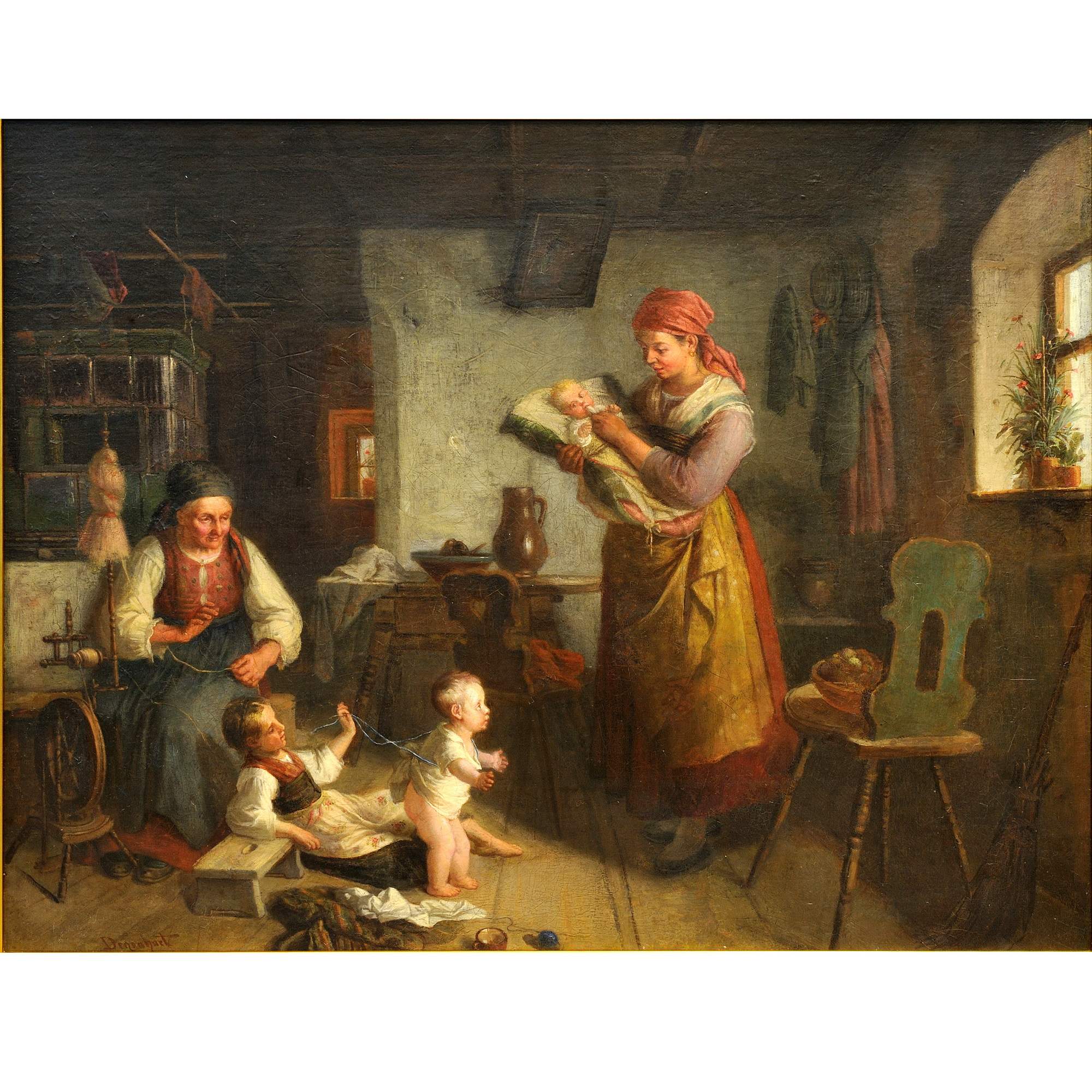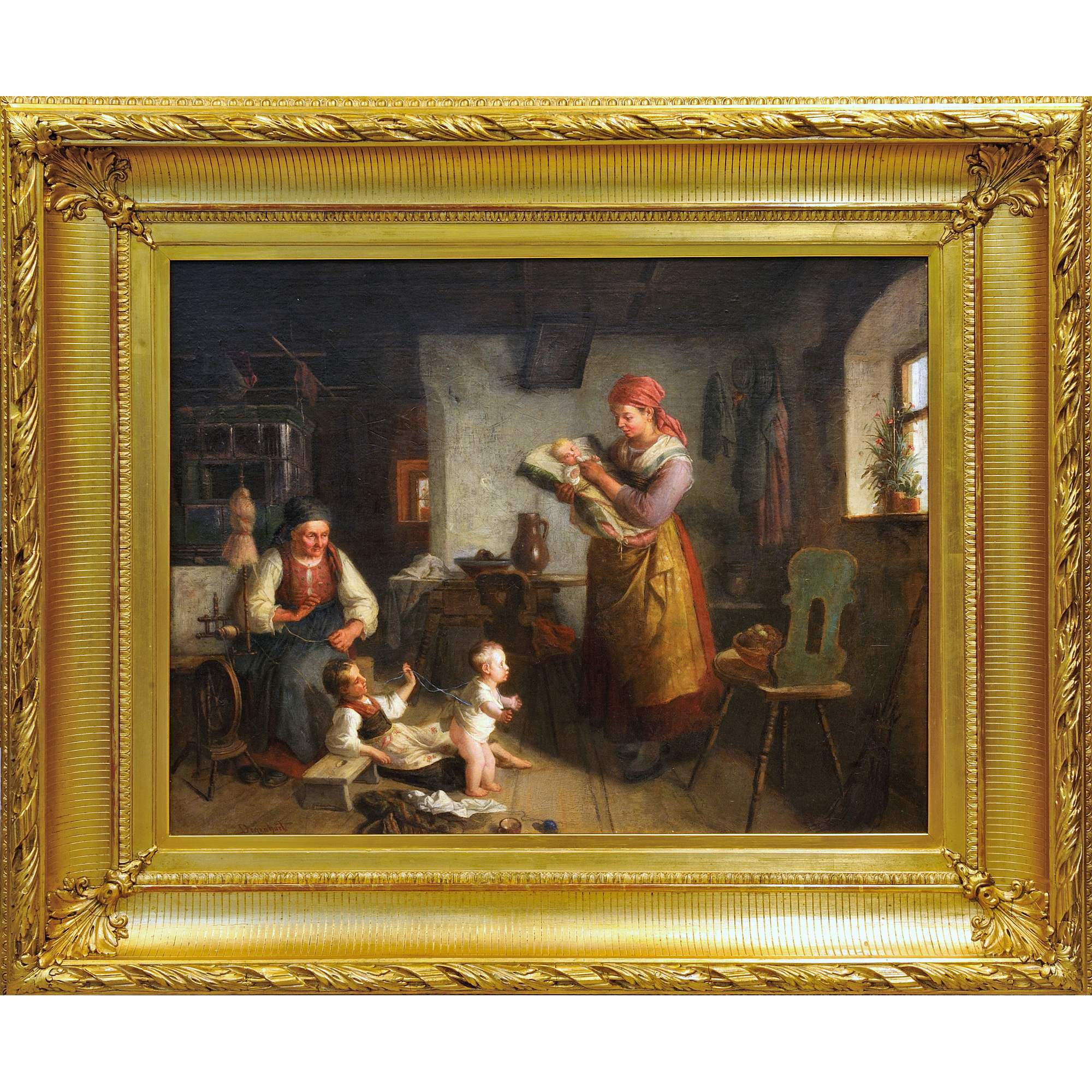Полотно принадлежит кисти талантливого живописца, получившего профессиональную подготовку. К сожалению сведений о художнике с такой фамилией на сегодня не обнаружено. Жанровая композиция на тему тихого семейного счастья в творчестве западноевропейских и особенно немецких художников занимает особое место. Неизвестному мастеру удалось на фоне скромного интерьера комнаты в полной мере передать непринужденную атмосферу домашнего уюта, душевную теплоту и ласку. Автору хорошо известны особенности поведения детей, с искренней любовью он изобразил очаровательных малышей, окруженных заботой ухаживающих за ними женщин. Очень светлая и радостная картина, вызывающая искренние положительные чувства, может существенно украсить интерьер семейного дома. Картина прошла бережную реставрацию и оформлена в красивую старую раму,