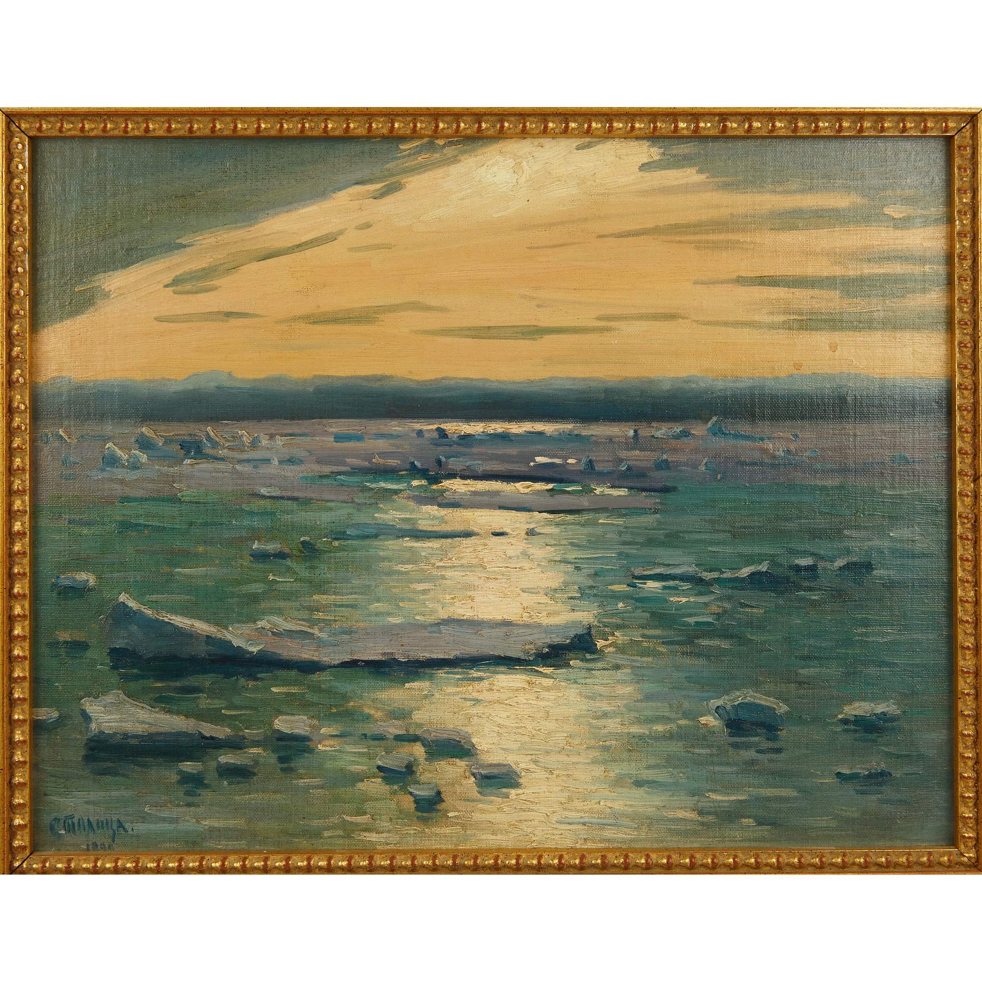 Море на закате солнца с плывущими льдинами , неяркий холодноватый колорит. Пейзаж написан в свободной импрессионистской манере, мастерски передана воздушная среда, множество нюансов и оттенков - художник продолжил традиции русской реалистичной пейзажной живописи. Картина создана в период расцвета творчества художника в ходе одной из двух знаменитых полярных экспедиций на ледоколе «Ермак».