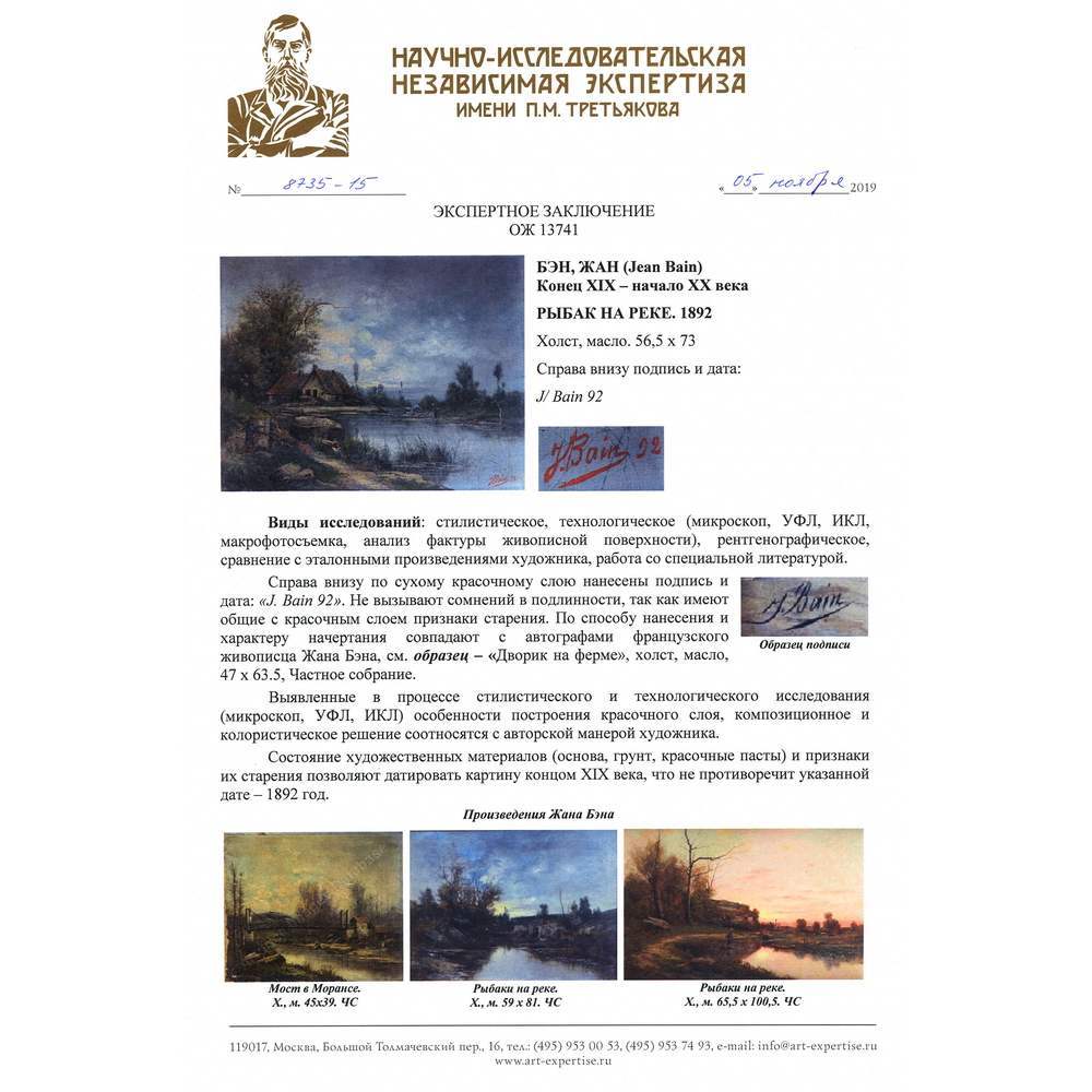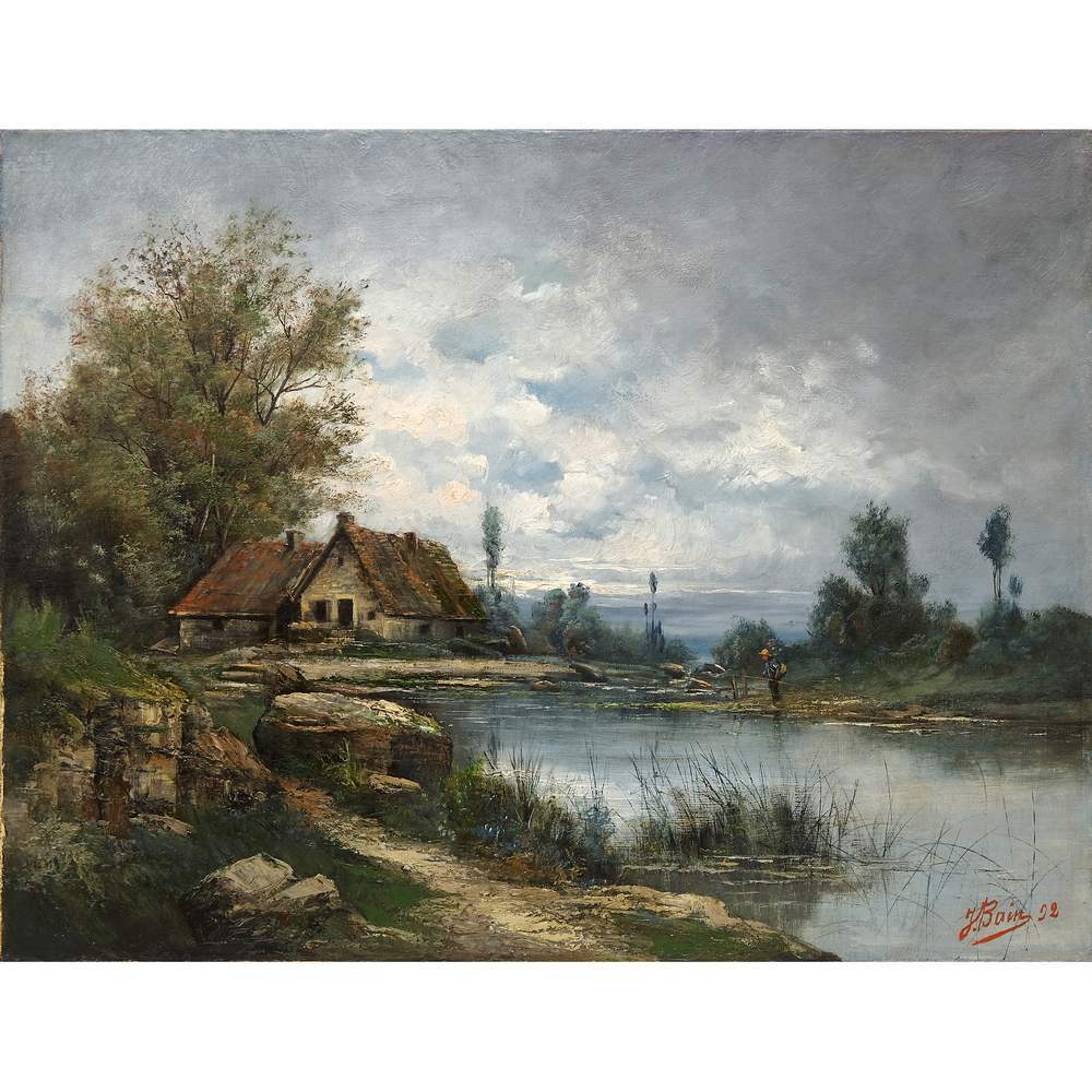 Творчество талантливого художника Жана Бена в основном посвящено видам французской провинции с изображением домов и ферм, сельских улиц, рек и озер в разные времена года. В предлагаемой работе живописец в свойственной ему манере с помощью разных приемов передает глубину и выразительность сюжета, главные элементы которого - небольшая речка с деревьями и домом на берегу. Тихий безветренный вечер, вечернее небо, одинокая фигура рыбака, умиротворенная атмосфера наполнены романтикой и переданы автором с большим мастерством и любовью.
