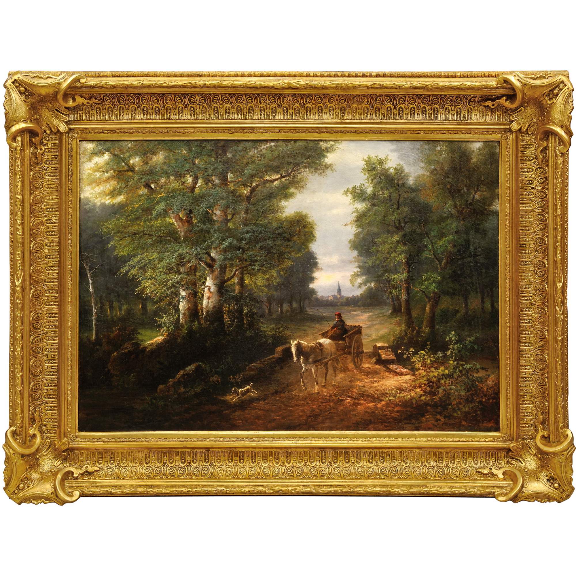 Пейзаж работы неизвестного профессионального художника конца ХIХ века выполнен в традиционной западноевропейской манере. В центре композиции - крестьянин на повозке, в сопровождении собаки и зеленая листва деревьев, пронизанная лучами солнца, на дальнем плане в серо- голубой дымке облаков виднеется колокольня. Высокий уровень живописного мастерства художника, авторский колорит, выразительные и простые средства передачи красоты природы позволяют отнести картину неизвестного мастера «Пейзаж с повозкой» к произведениям, имеющим антикварное и коллекционное значение.
